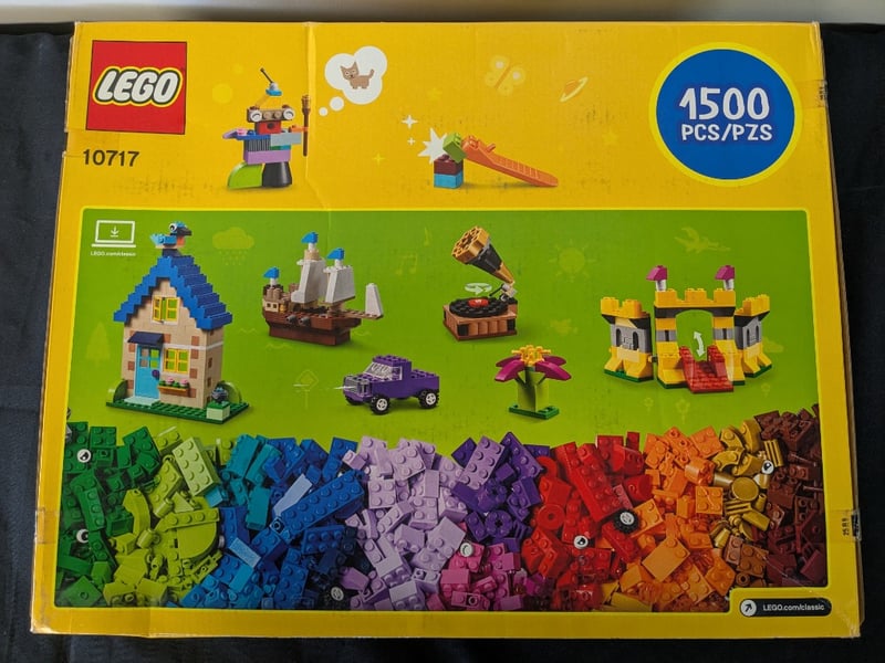 Lego Classic Set 10717 Containing 1500 Colourful Bricks In Assorted Colours Including Green, Blue, Purple, Pink, Red, Orange, Yellow And Tan. Box Displays Building Inspiration Examples Including A House, Ship, Vehicle, Flower, Castle And Elephant. Includes "Ideas Included" Instruction Booklet. Set Designed For Creative Open-Ended Building And Imaginative Play. Comprehensive Colour-Sorted Brick Collection Ideal For Both Novice And Experienced Builders.