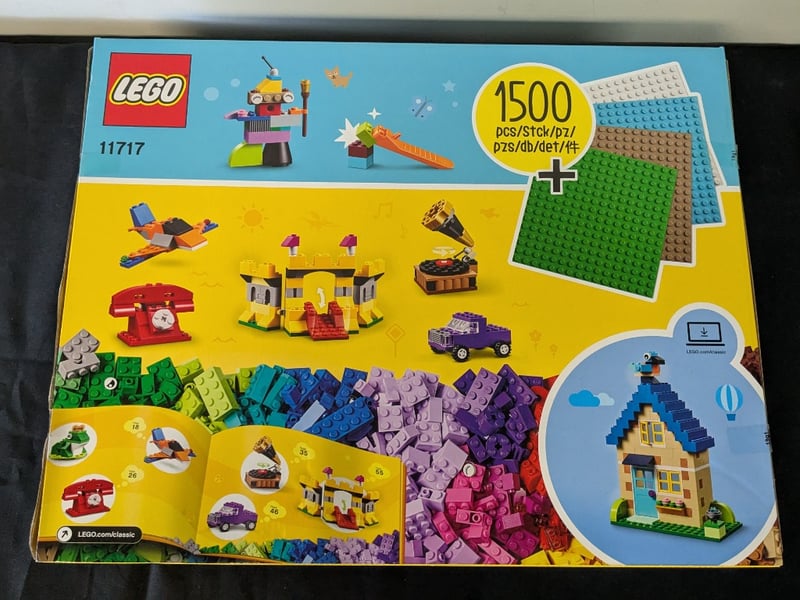 Lego Classic Set 11717 Featuring 1500 Bricks In Assorted Colours Including Green, Yellow, Cyan, Blue, Purple, Pink, Red, And Orange. Includes Two Baseplate Building Surfaces And Instruction Booklet With Multiple Build Ideas. Set Contains Pre-Formed Elements Such As A Sailing Ship, Robot Figure, Flower, Elephant, Car, Telephone, Castle Structure, And House With Hot Air Balloon