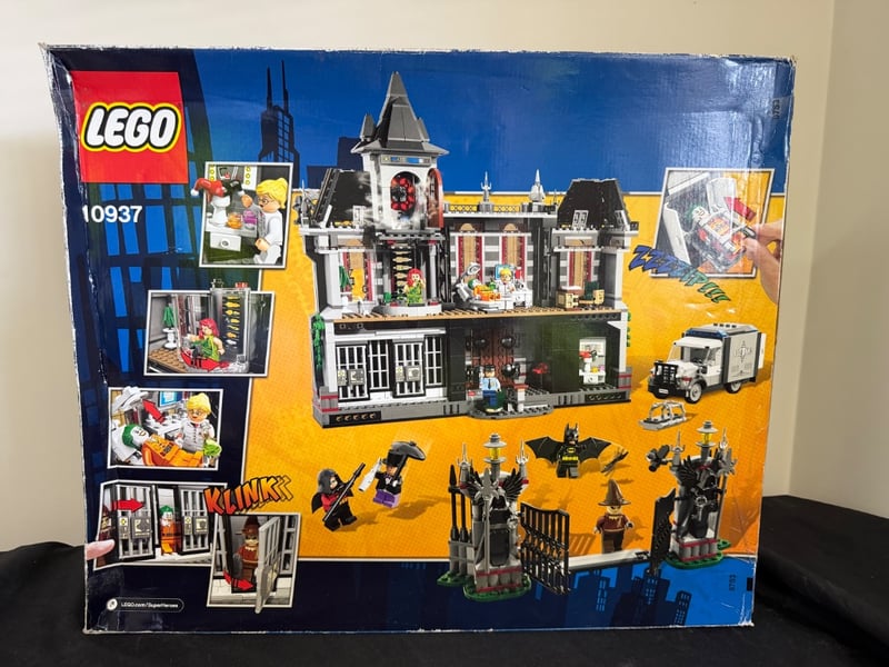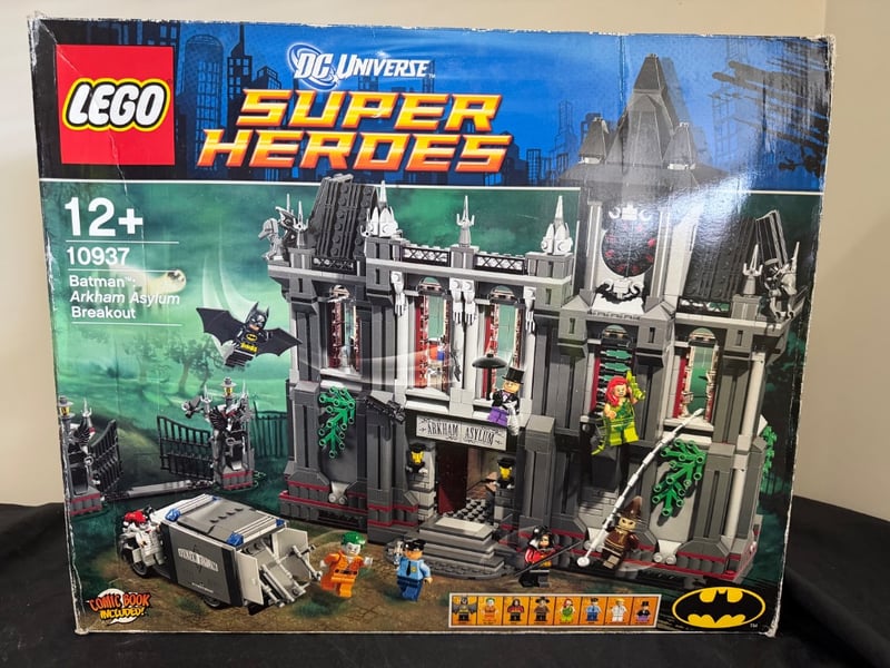 Vintage Lego Dc Universe Super Heroes Set 10937 Featuring The Batman Arkham Asylum Breakout Playset. Includes Detailed Asylum Building With Multiple Rooms, Guard Tower, Vehicle, And Eight Minifigures