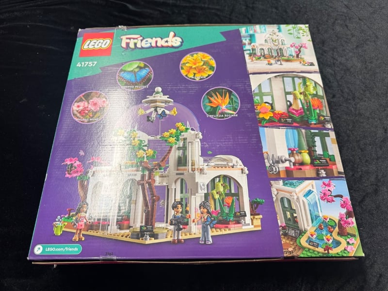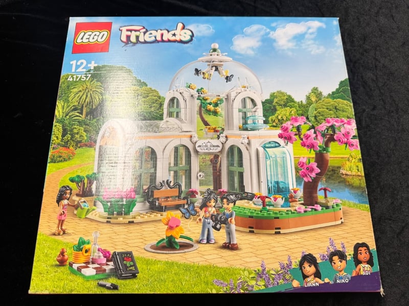 Lego Friends Set 41757 Featuring A Detailed Botanical Garden Structure With Dome Conservatory, Featuring Pink Flowering Plants, Decorative Elements, Minifigures Landscaped Grounds With Water Feature, And Accessory Pieces. Age Rating 12+.