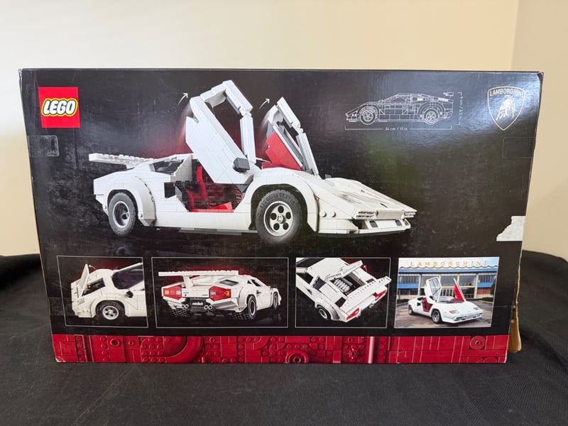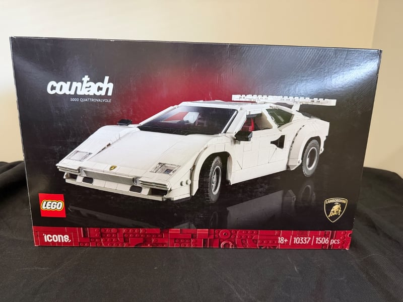 Lego Icons Lamborghini Countach 5000 Quattrovalvole (Set 10337) Featuring 1506 Pieces With Opening Doors, Hood, And Trunk. White Construction With Detailed Red Interior, Authentic Lamborghini Branding, And Functional Steering Mechanism