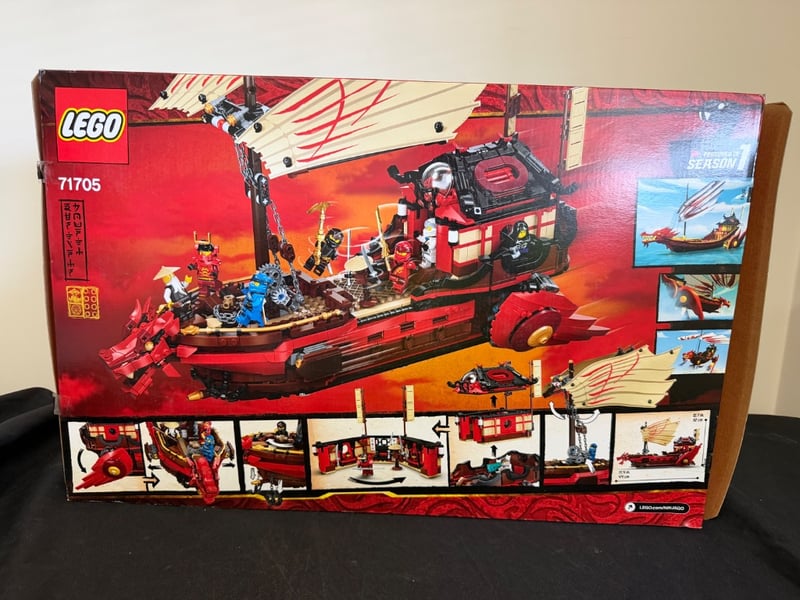 Lego Ninjago Legacy Set 71705 "Destiny'S Bounty" Featuring A Large Red And Cream Sailing Vessel With Articulated Sail, Dragon Figurehead, And Detailed Deck Structures. Includes Multiple Minifigures And Accessories.