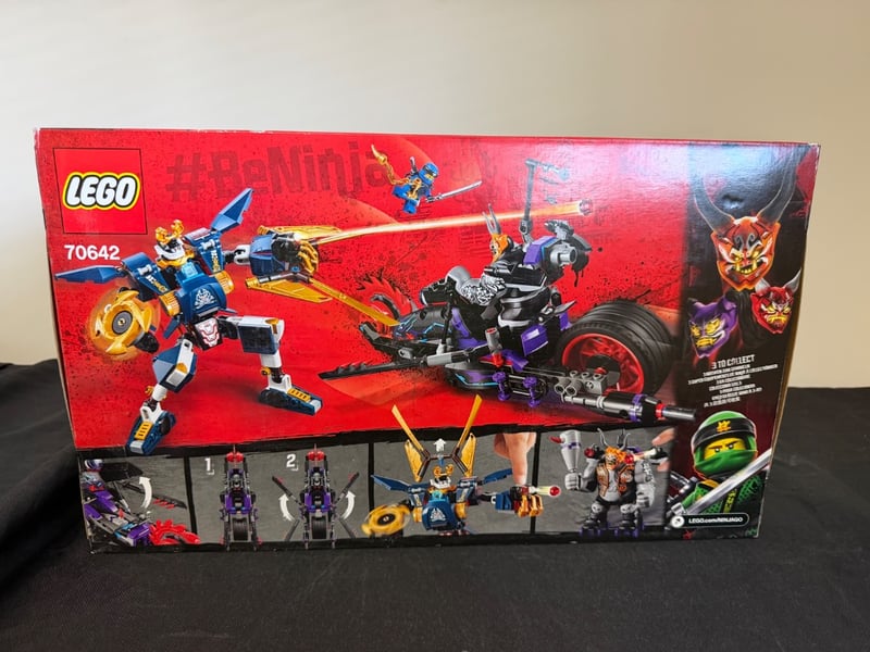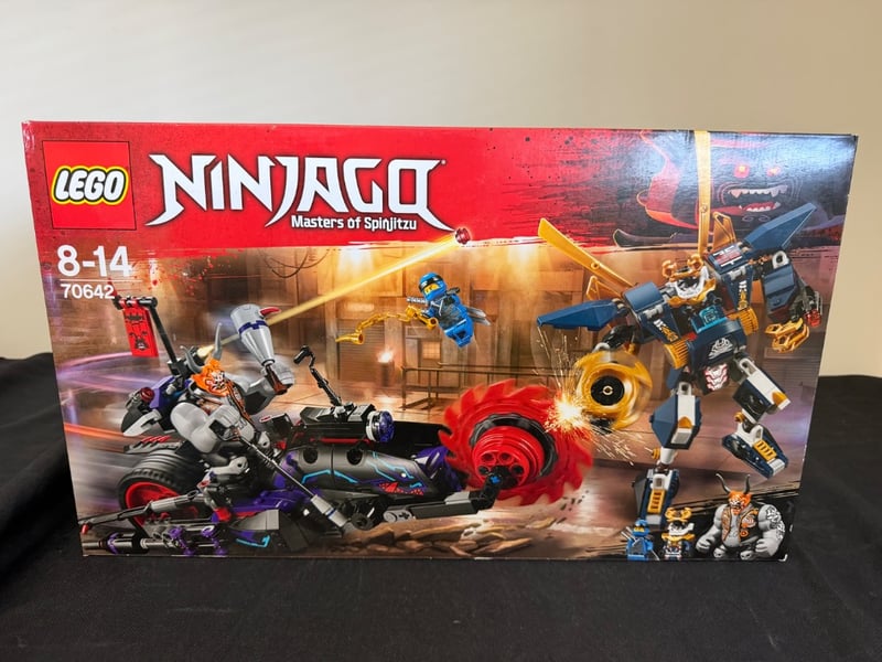Lego Ninjago Masters Of Spinjitzu Set 70642 Featuring Ninja Minifigures, Motorized Vehicles With Spinning Elements, And Detailed Action Pieces. Includes Blue Ninja Mech Suit, Black Villain Motorcycle With Red Wheels, And Multiple Character Minifigures With Accessories.