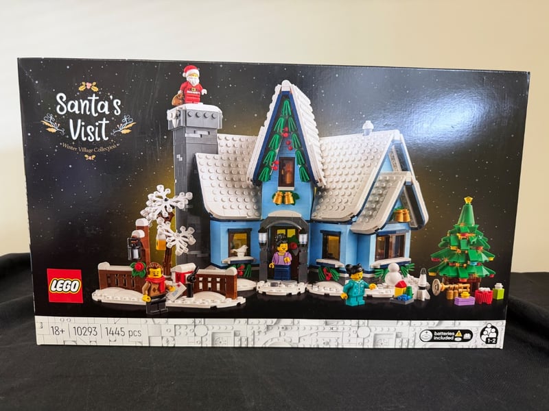 Lego Santa'S Visit (Set 10293) - Winter Village Collection Featuring A Charming Blue Cottage With Snow-Covered Roof, Chimney With Santa Figure, Decorated Christmas Tree, And Multiple Minifigures. Includes 1445 Pieces, Designed For Ages 18+. Features Illuminated Windows, Detailed Interior Spaces, And Festive Accessories