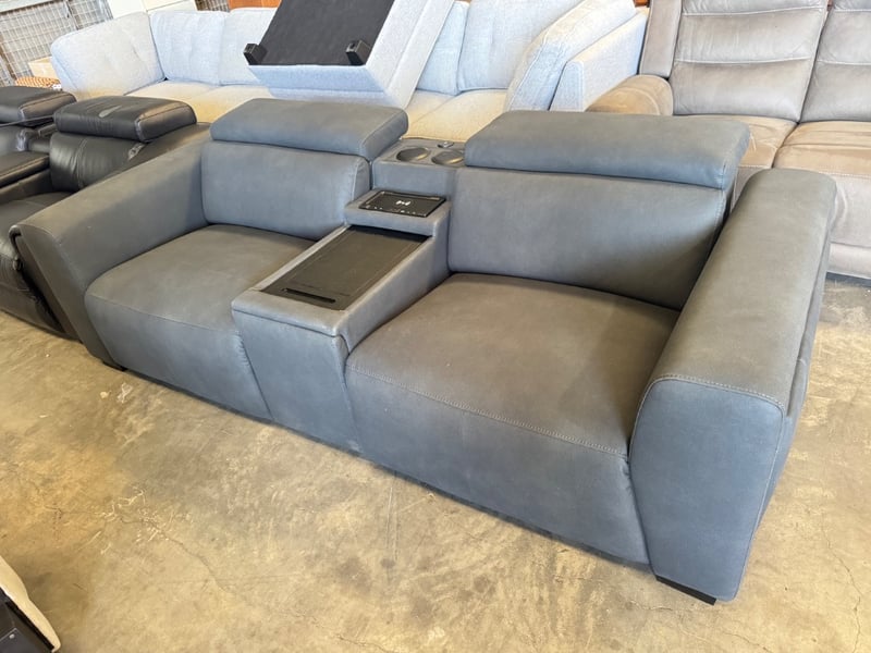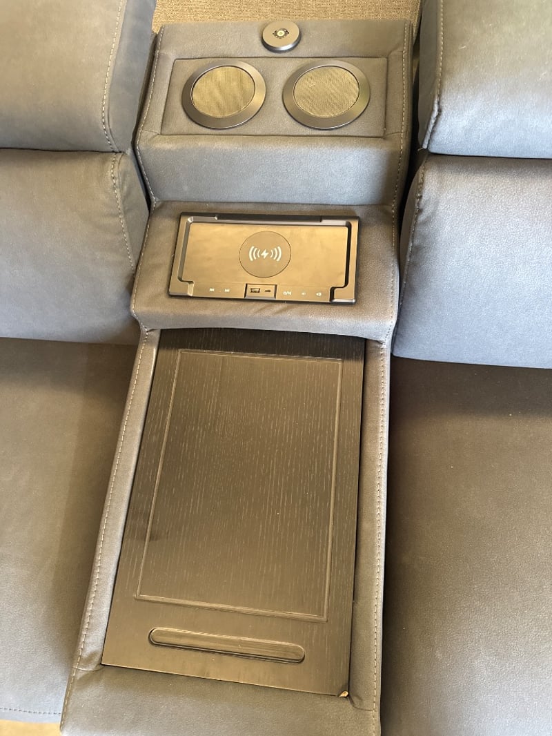 Modern grey leather reclining loveseat with integrated center console featuring dual cup holders and wireless phone charging pad.