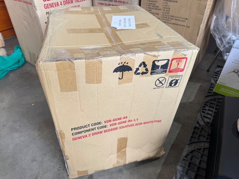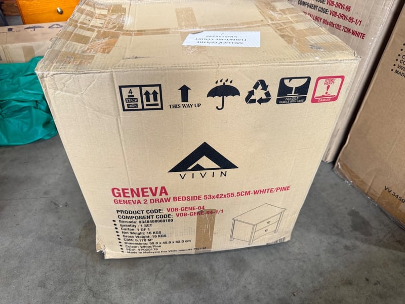 VIVIN Geneva 2 Drawer Bedside Table in White/Pine finish. Dimensions 53x42x55.5cm. Flat-pack furniture featuring two practical drawers for bedroom storage. Product code VOB-GENE-04. New, factory-sealed in original cardboard packaging with international shipping markings and handling instructions clearly displayed. Handle with care labels present. Suitable for modern bedroom settings requiring compact, functional bedside storage solutions.