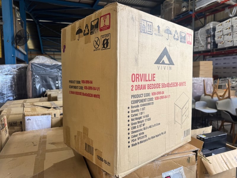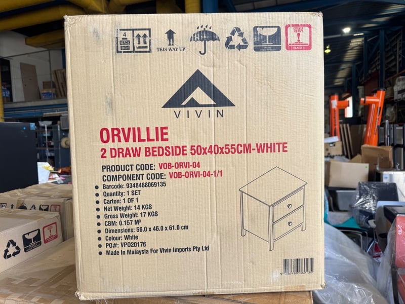 Vivin Orvillie 2-Drawer Bedside Table in White. This modern bedside furniture piece features clean lines and practical design with two spacious drawers for storage. The unit is finished in white, complementing contemporary and minimalist bedroom aesthetics. Made in Malaysia by Vivin Imports Pty Ltd, this flat-pack furniture item comes complete and ready for assembly. Product code VOB-ORVI-04.