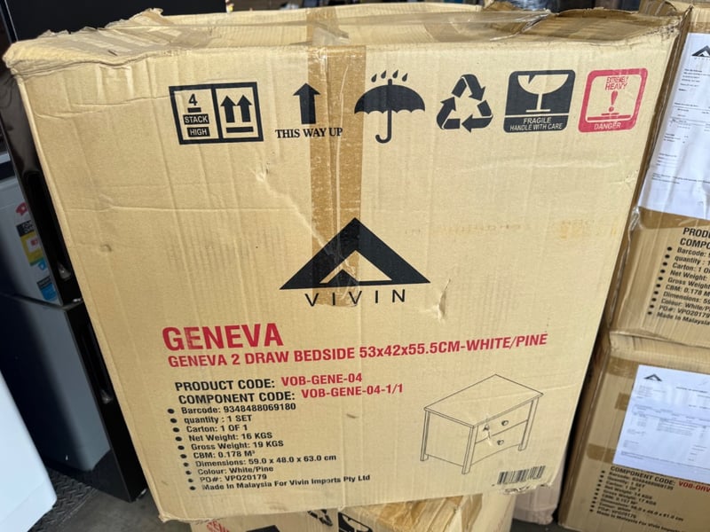 Vivin Geneva 2 Drawer Bedside Table in White/Pine finish. Flat-pack furniture featuring two storage drawers with dimensions of 53cm width x 42cm depth x 55.5cm height. Made in Malaysia by Vivin Imports Pty Ltd. Product code VOB-GENE-04. Includes all necessary components for assembly. Original factory packaging with handling labels intact including "This Way Up," fragile warning, and weather protection indicators.