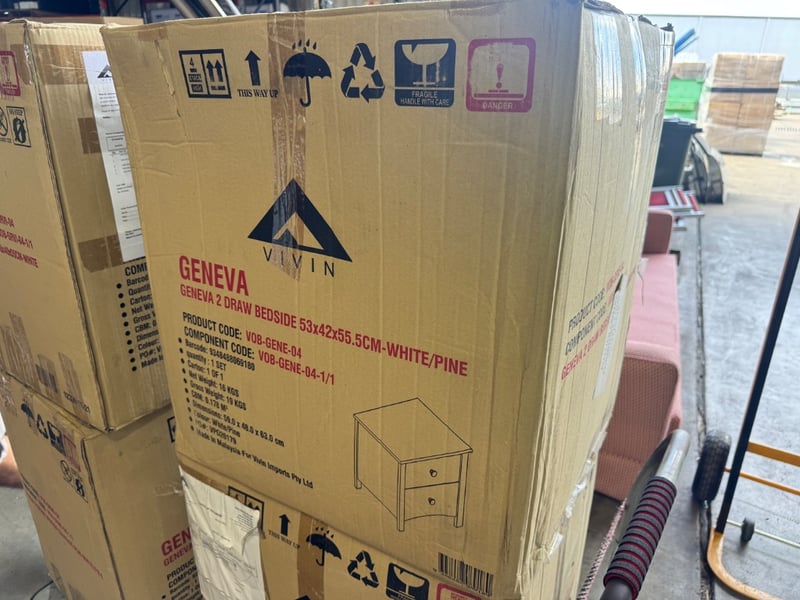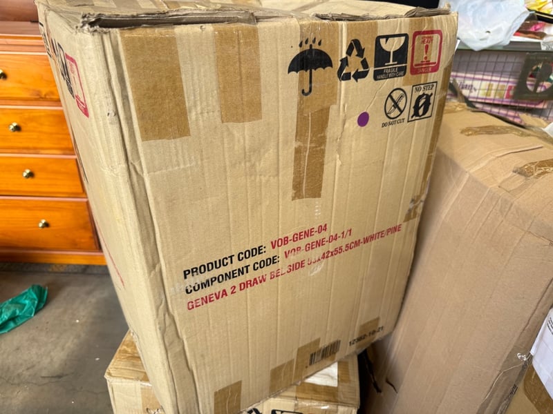 Vivin Geneva 2 Draw Bedside Table in White/Pine finish. Flat-pack furniture featuring two functional drawers with dimensions of 53cm height x 42cm width x 55.5cm depth. Product code VOB-GENE-04 with component code VOB-GENE-04-1/1. New in sealed cardboard packaging with international shipping labels and handling instructions clearly marked. Includes fragile warning indicators and recycling symbols. Suitable for bedroom, living room or general domestic use.