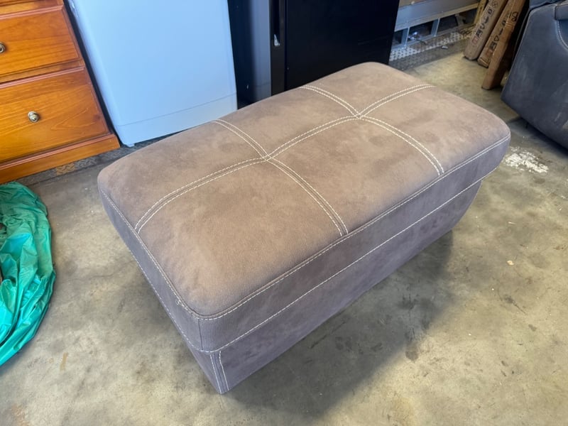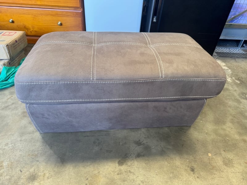 Upholstered storage ottoman in taupe/grey fabric with contrasting cream stitching detail. Features a quilted top surface with geometric cross-stitch pattern across six padded sections. The piece showcases clean lines with a rectangular footprint and sits on a substantial base. Decorative top-stitching runs along all edges and divides sections vertically and horizontally, creating a structured, tailored appearance. The fabric exhibits a subtle weave texture characteristic of durable upholstery material. This functional piece combines contemporary styling with practical storage capability, making it suitable as a footrest, seating solution, or bedroom/living room accent. Dimensions: 110cm x 64cm x 45cm
