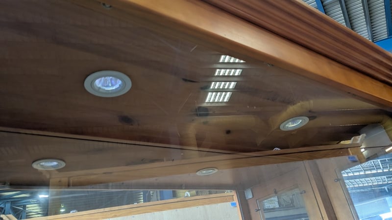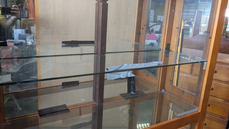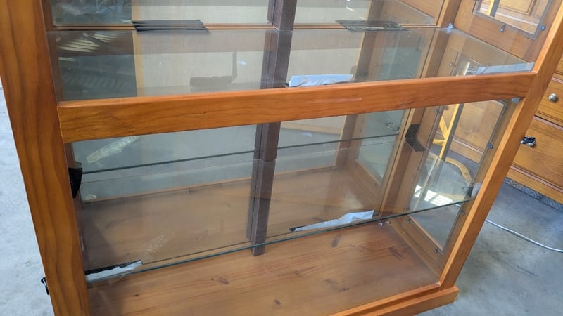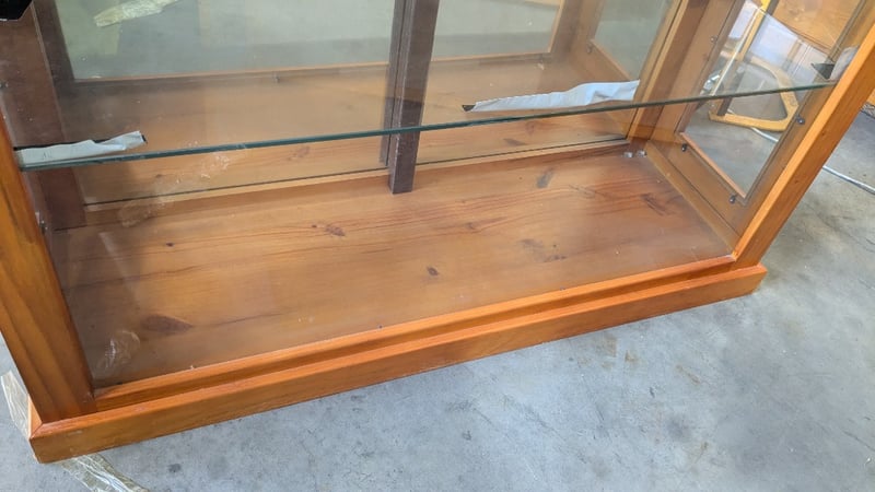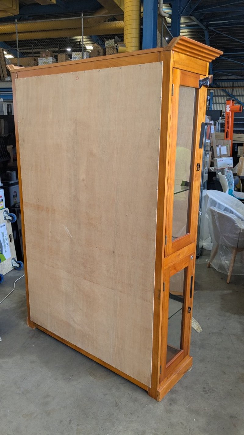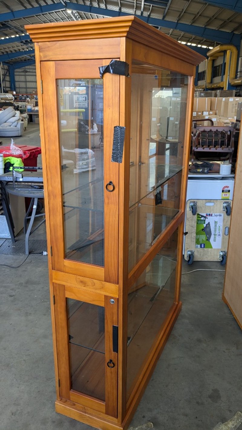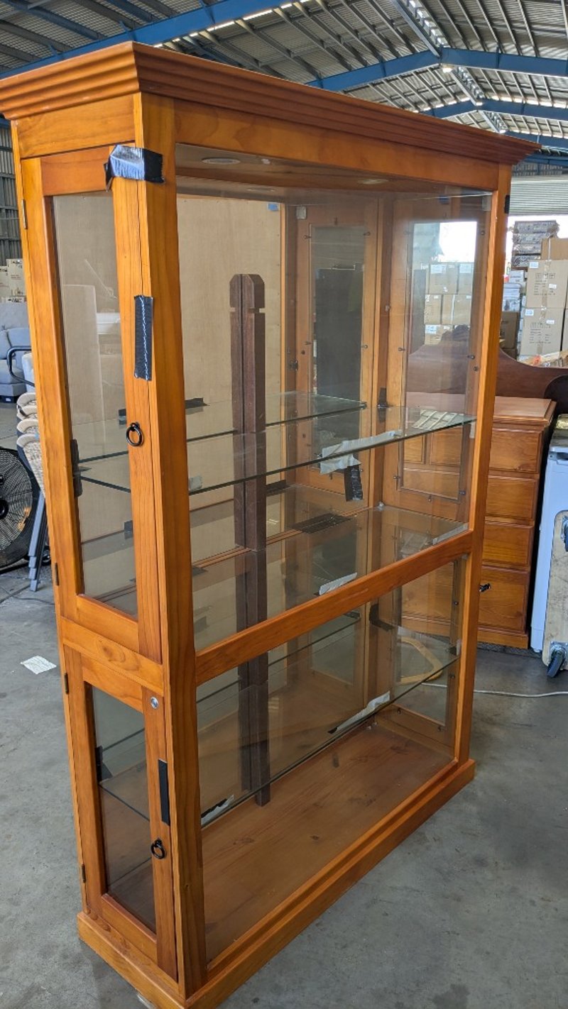 Timber Display Cabinet, Glass Shelves, Medium Stained Timber Finish, Lockable, 3 Tier, Over Head Lighting