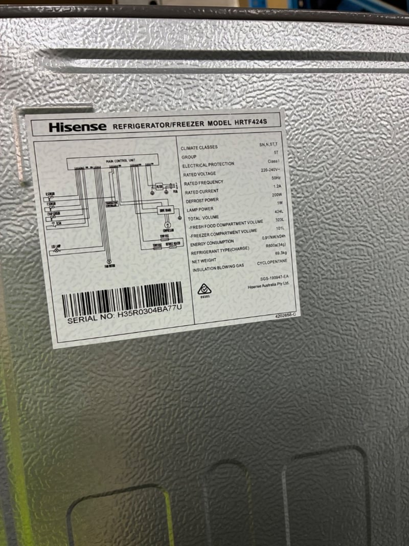 Refrigerator, Hisense Model: HRTF424SCondition: UsedDimensions: H 170cm W 70cm L 70cm