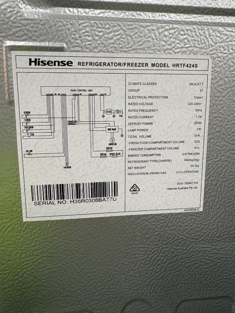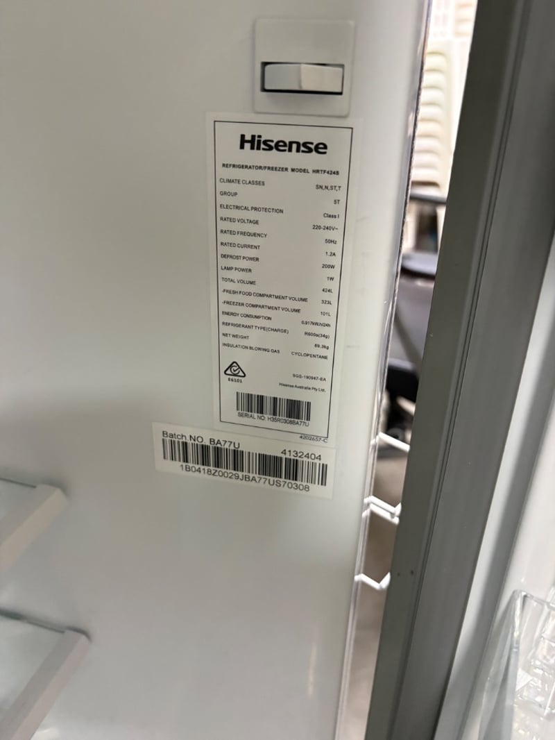 Refrigerator, Hisense Model: HRTF424S Working Condition Unknown Dimensions: H 170cm W 70cm L 70cm