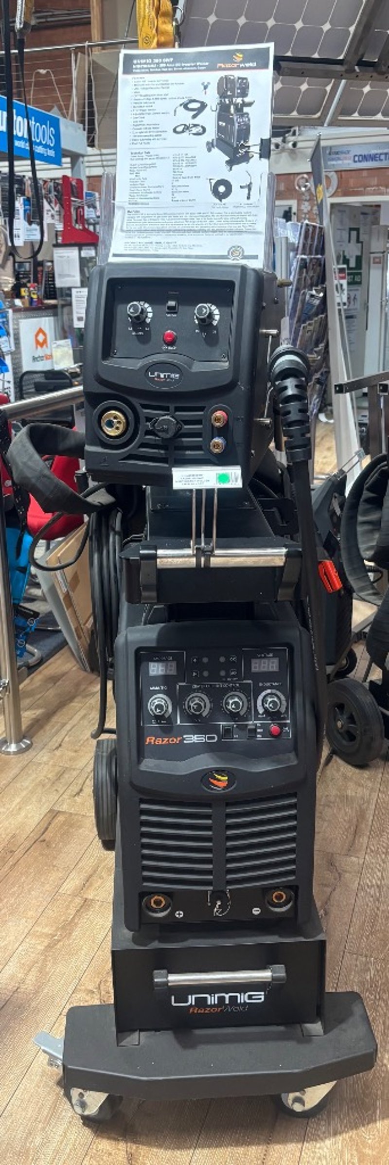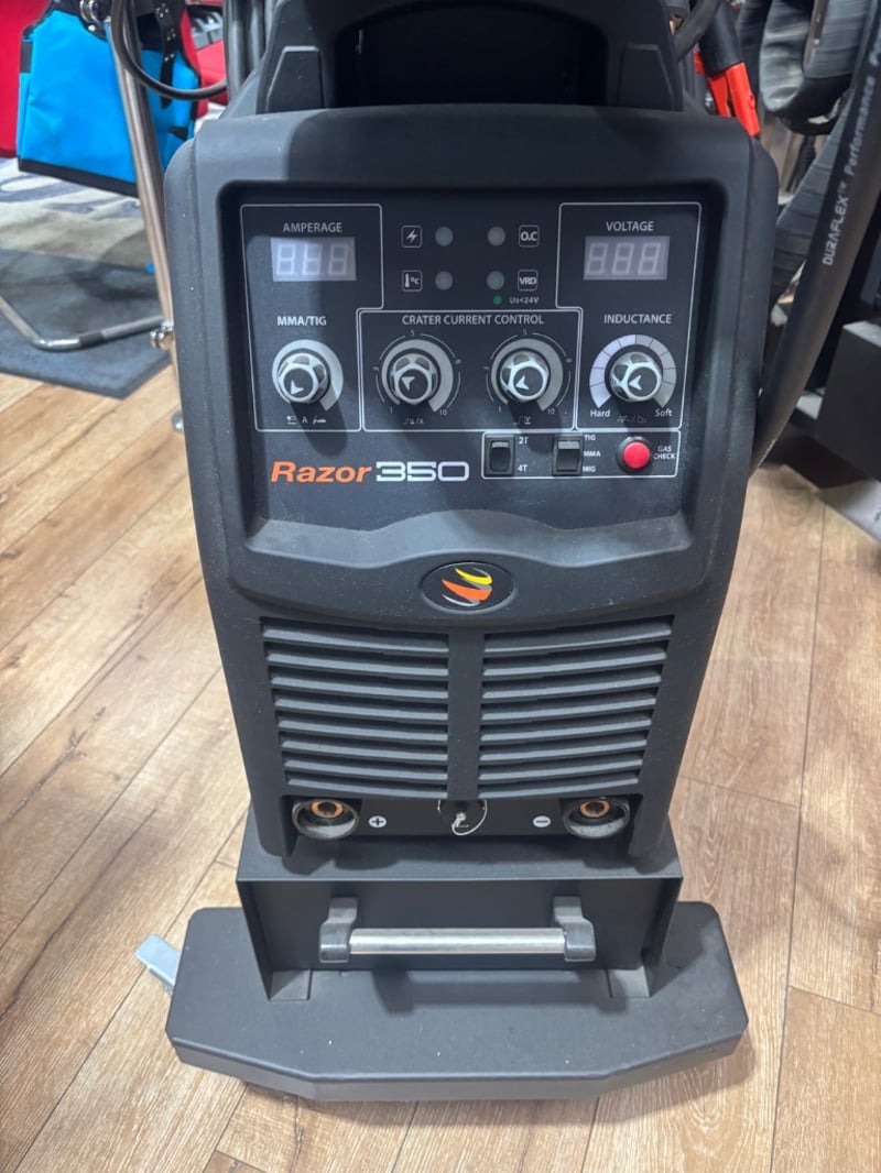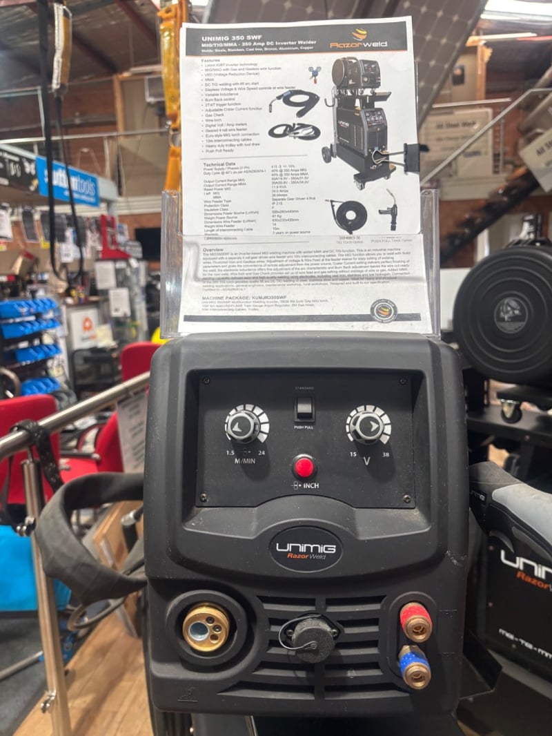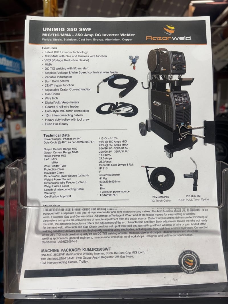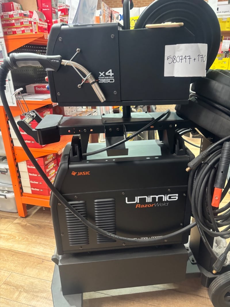 RRP: $4,445.45 UNIMIG Razor 350 SWF Industrial Welder Package Includes: • UNIMIG Razor 350 power source • Separate 4-roll wire feeder • MIG torch and leads • Interconnecting cables • Heavy-duty trolley system • Cable set as pictured Sold as Lot Note: Untested / As Displayed