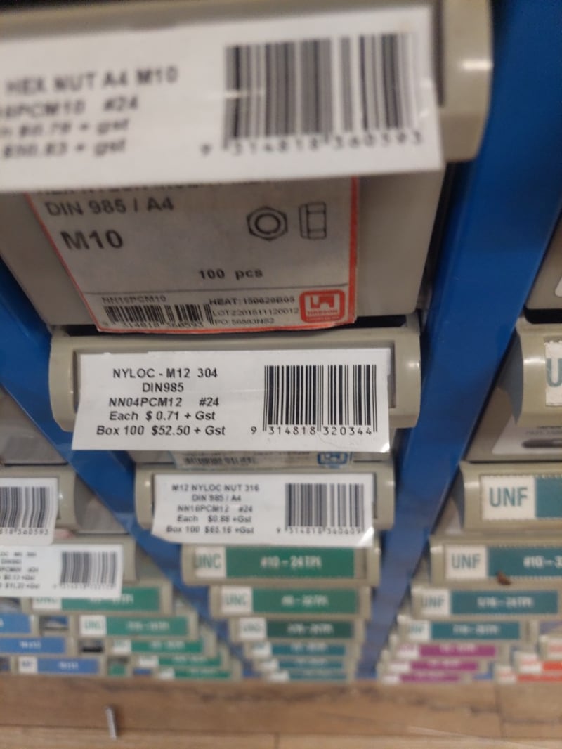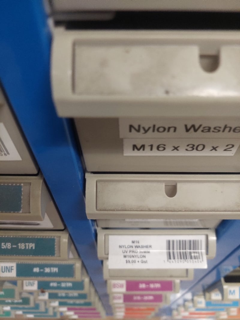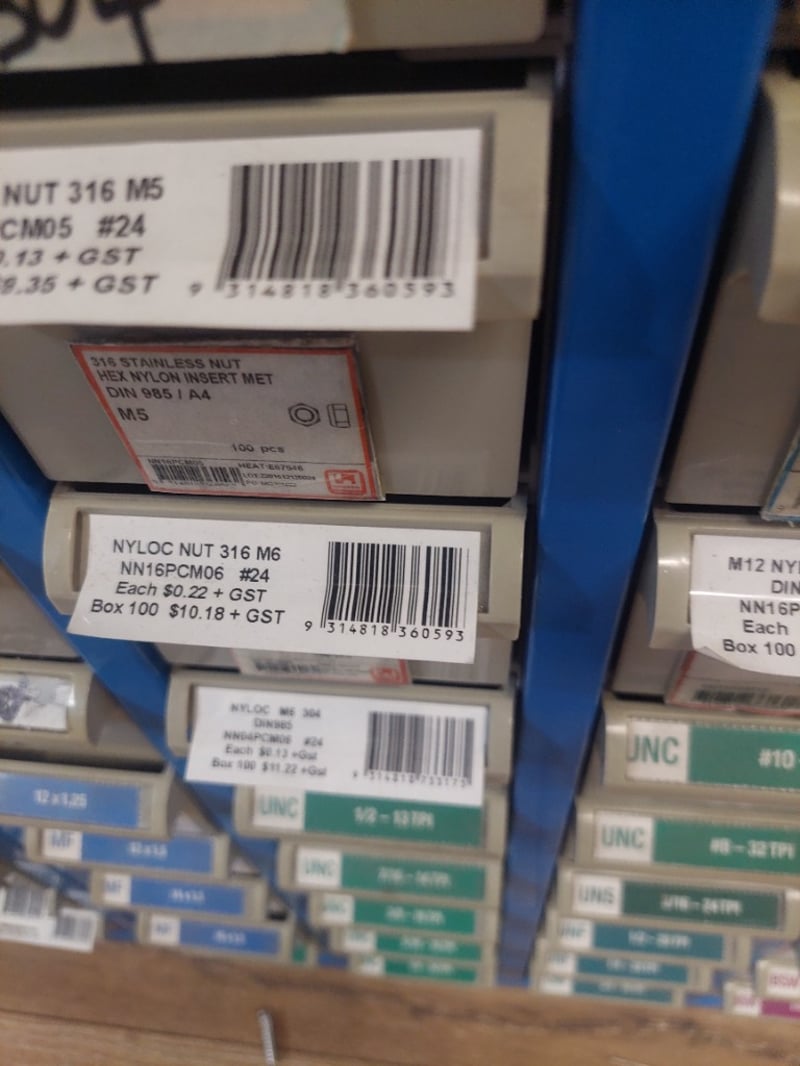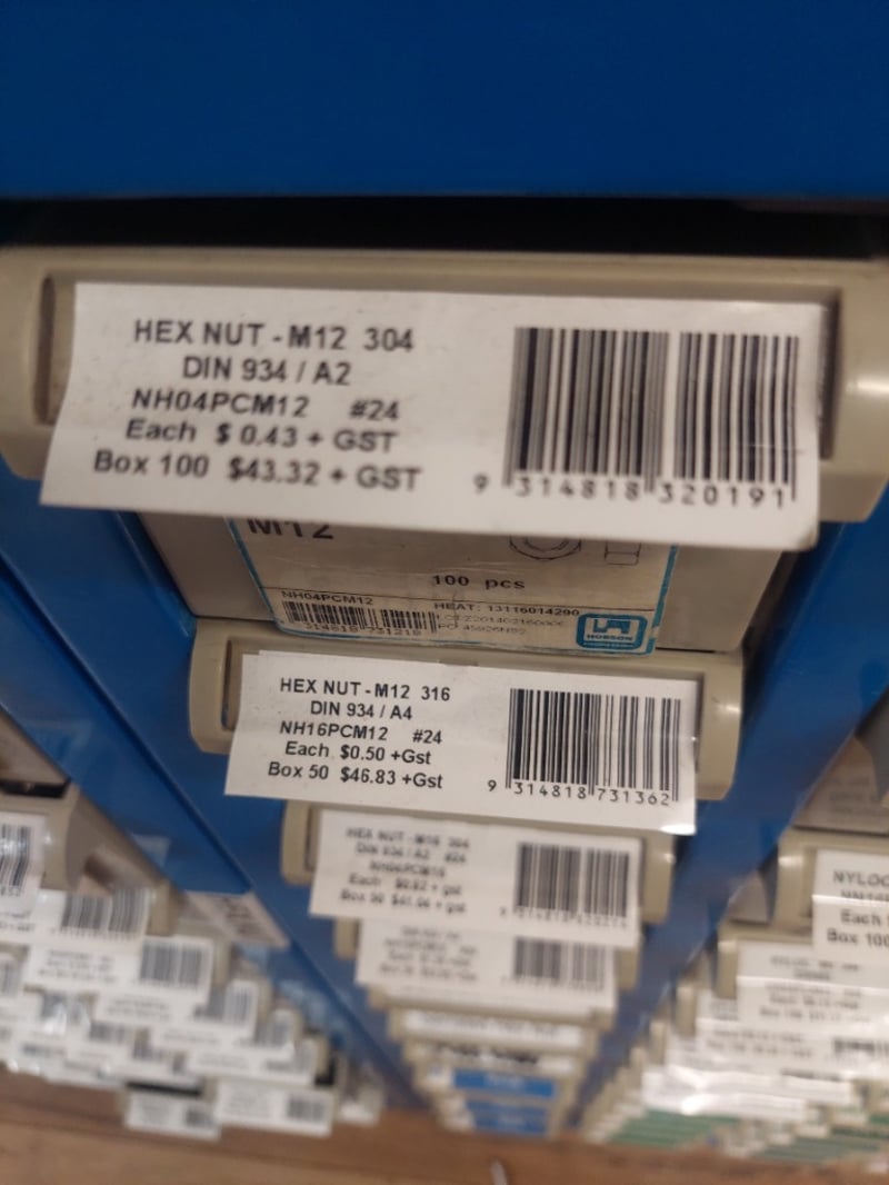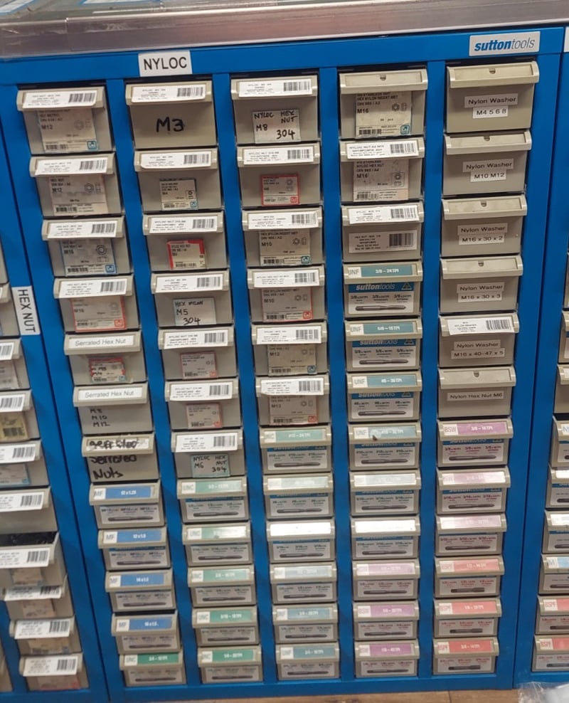 Comprehensive industrial hardware storage cabinet featuring a blue metal frame with multiple compartments. Contains extensive inventory of fasteners including hex nuts (M3, M5, M10, M12, M16 variants in 304 and 316 stainless steel), nylon washers (M10-M16 sizes), and more.Sold as lot Note: some compartments may be empty