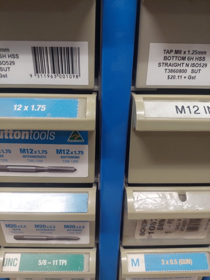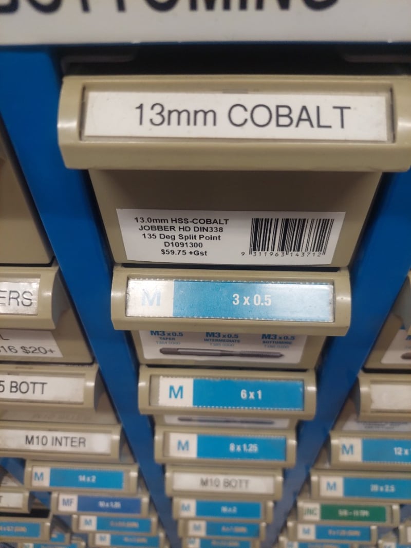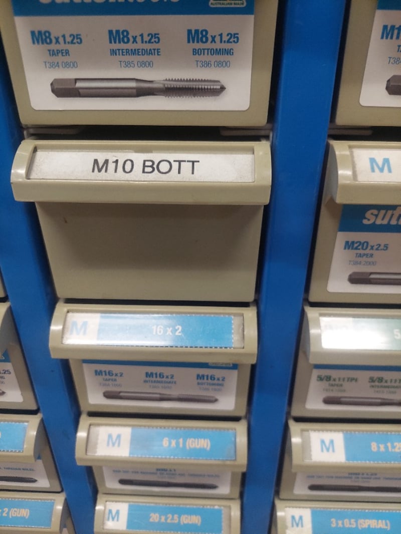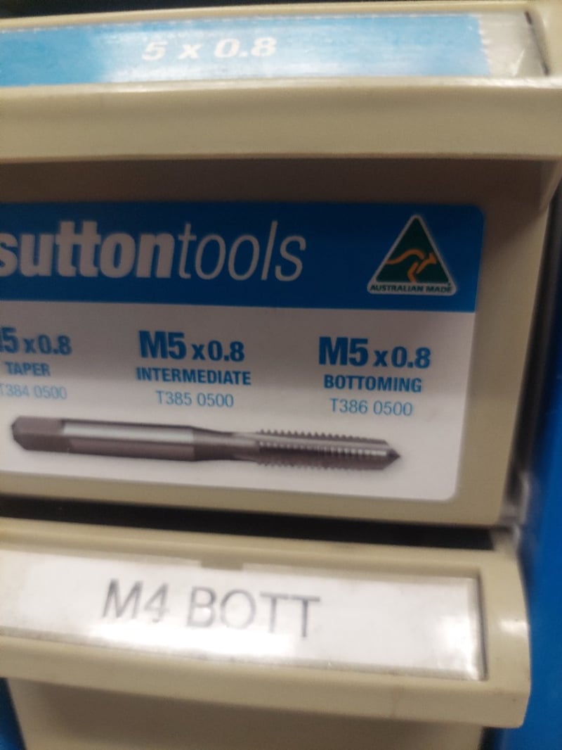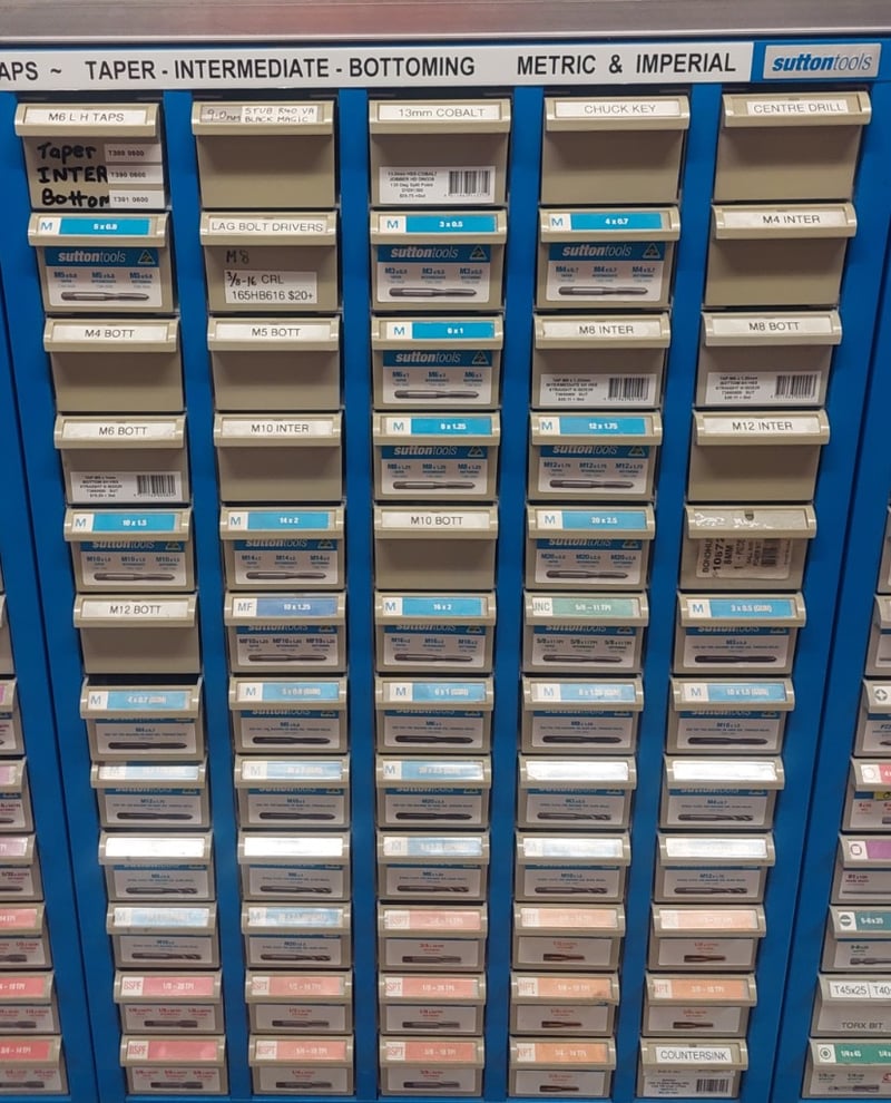 Sutton Tools metric and imperial taps and dies storage cabinet system. Blue metal frame display unit featuring organized compartments containing an extensive collection of tapping and bottoming tools. Contents include M3-M20 metric taps in taper, intermediate, and bottoming configurations, plus imperial sizes. Notable items visible include 13mm cobalt HSS-cobalt jobber drill bit (DIN338, 135° split point), M5x0.8, M8x1.25, M12x1.75, and M20x2.5 metric taps in various profiles and more...Sold as lotNote: some compartments may be empty