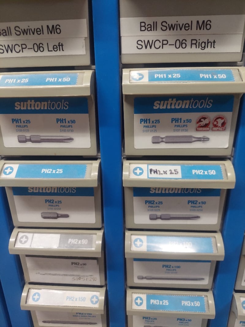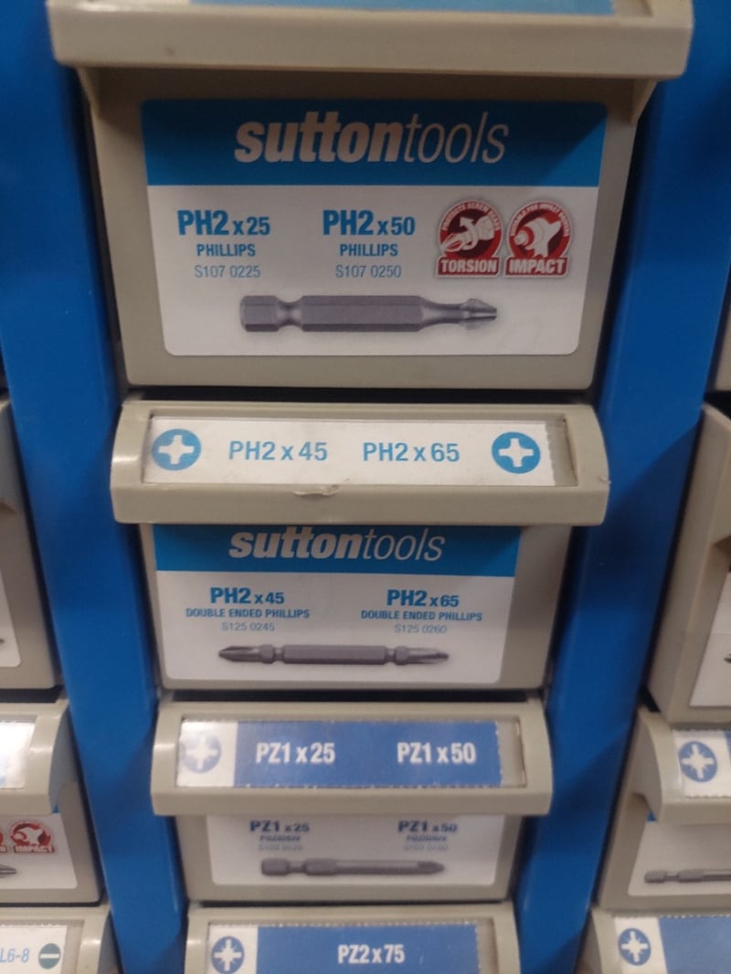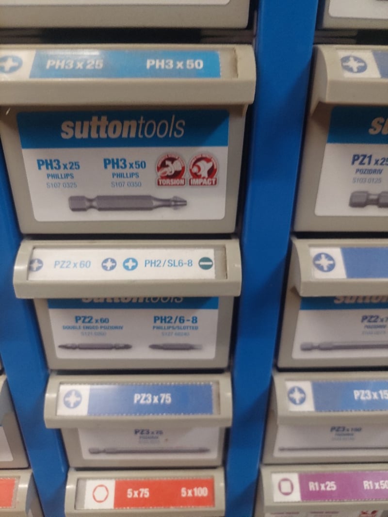 Sutton Tools modular storage organizer display unit featuring a comprehensive assortment of precision screwdriver bits and accessories. The blue metal framework wall-mounted cabinet contains multiple shallow drawers organized by bit type, including Phillips (PH1, PH2, PH3), Pozidriv (PZ1, PZ2, PZ3), and specialty bits in various lengths (25mm, 45mm, 50mm, 65mm, 75mm, 100mm). Sold as lot Note: some may have Emory compartments