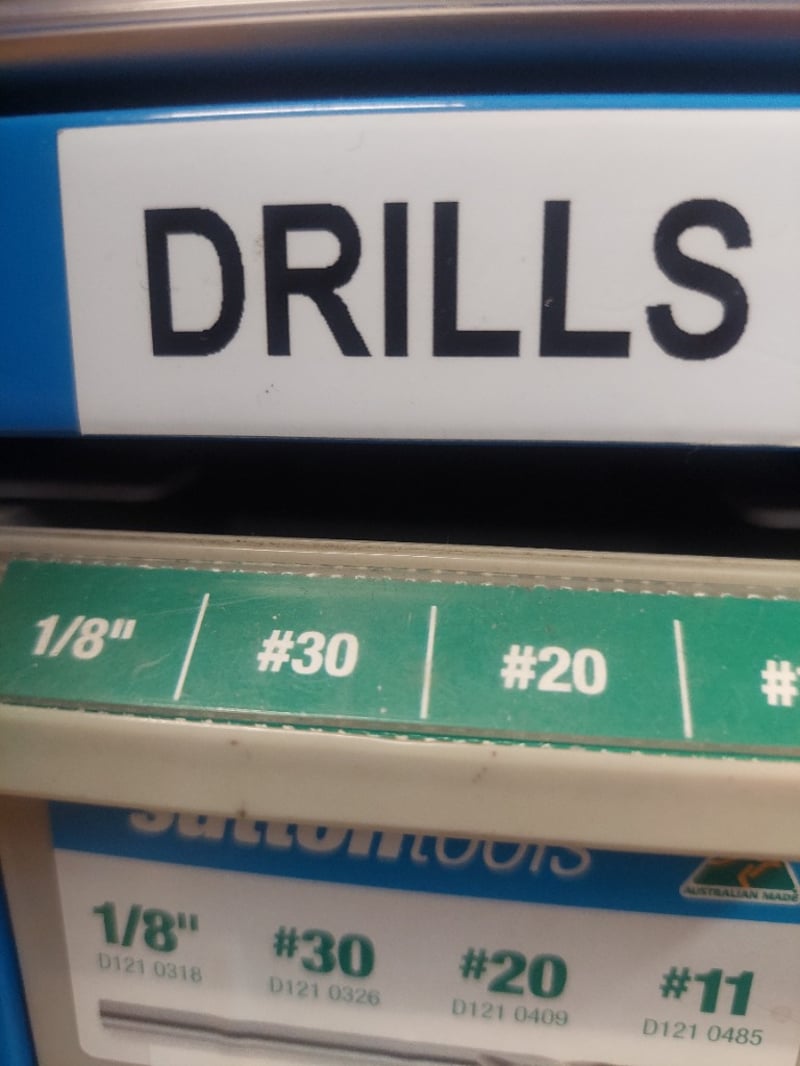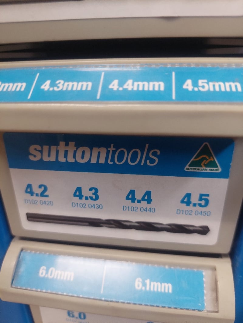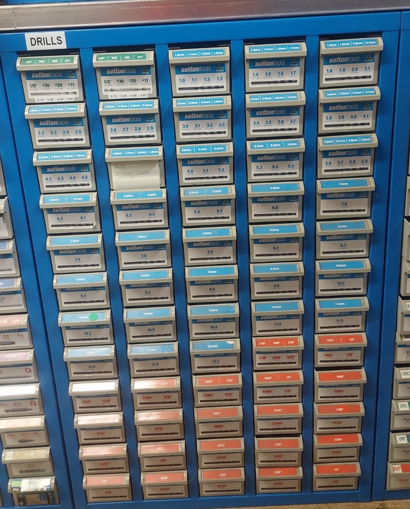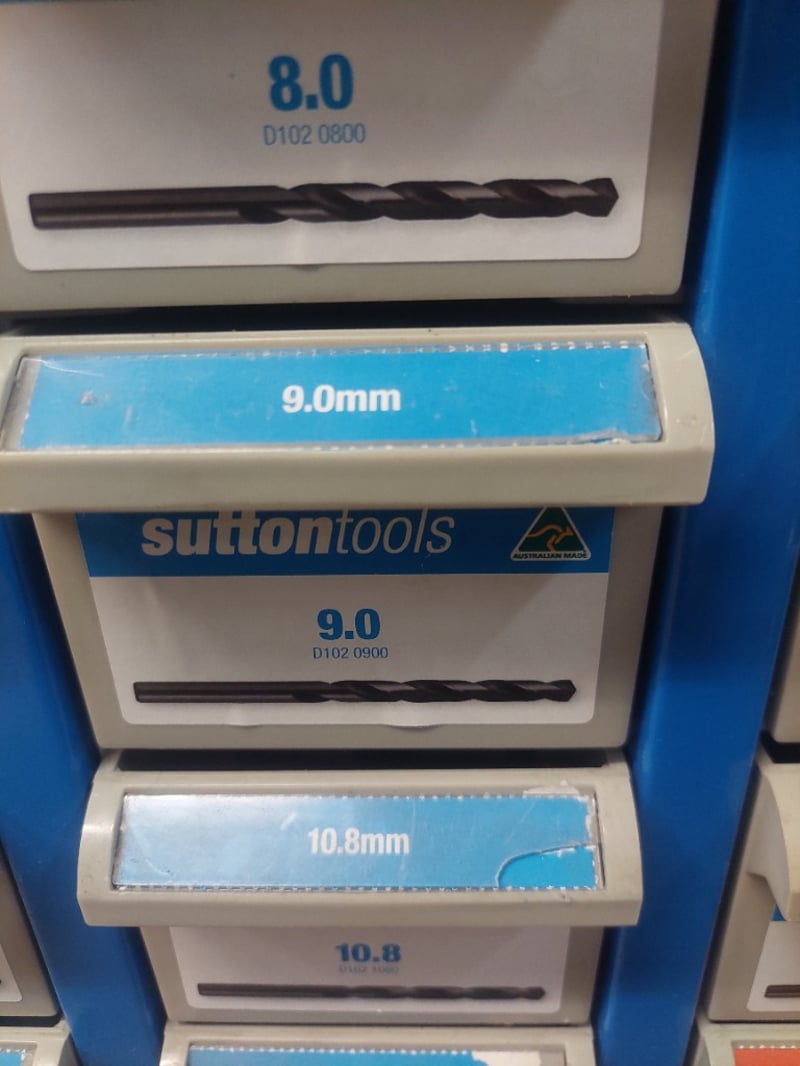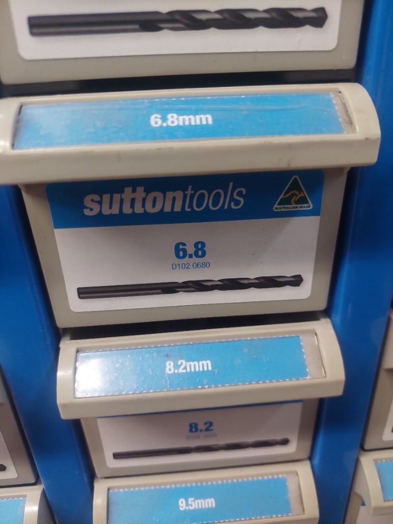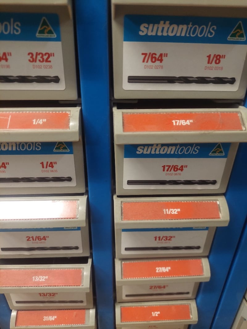 Sutton Tools blue metal drill storage cabinet featuring comprehensive organization system. Wall-mounted display unit containing extensive collection of metric and imperial twist drills ranging from 1/8" to 10.8mm and larger fractional sizes up to 1/2". Cabinet displays drills in individual compartments with labeled blue and orange headers indicating drill sizes. Sold as lot
