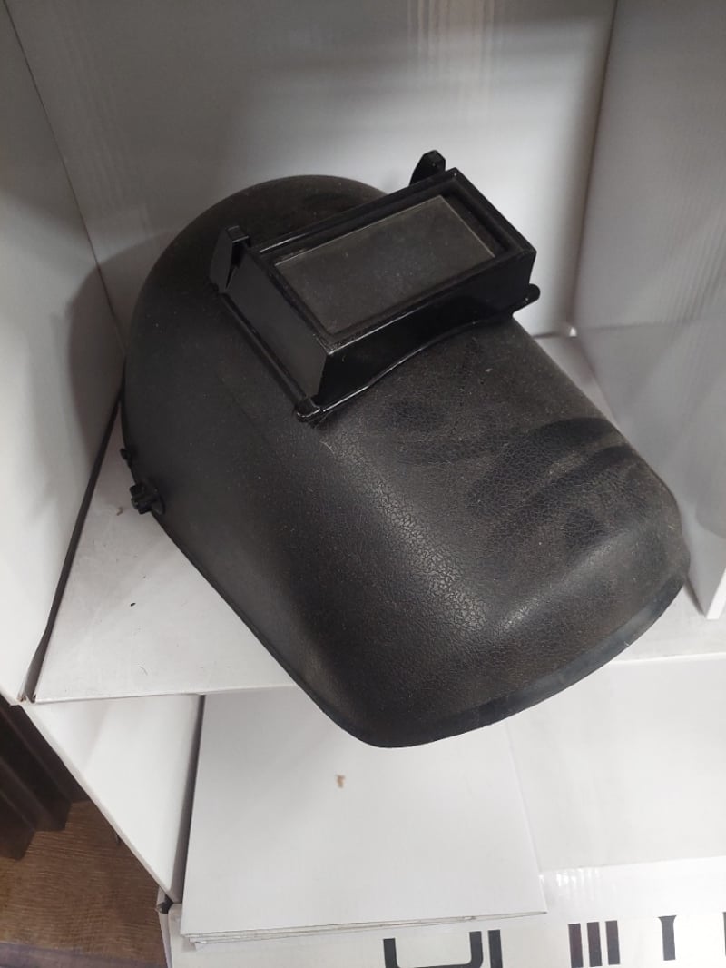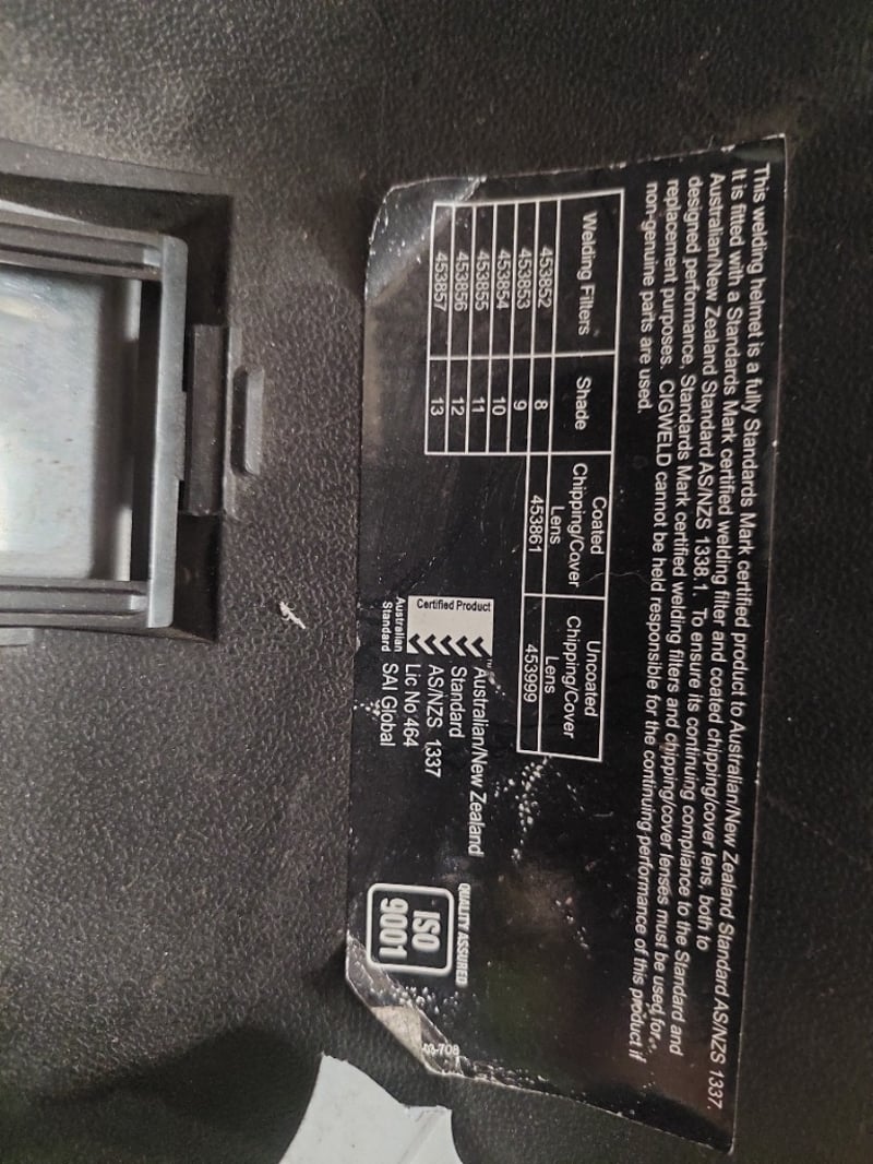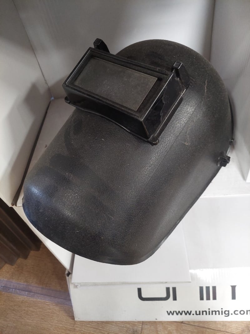 Unimig welding helmet with auto-darkening lens and flip-up viewing window. Black polymer construction with adjustable headgear. Features rectangular auto-darkening filter window mounted on front dome. Includes side adjustment mechanism for secure fit. Note: untested,signs of wear