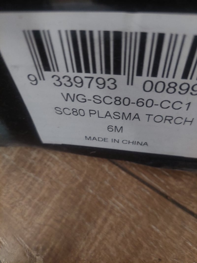 Unimig SC80 plasma torch, 6m cable length, model WG-SC80-60-CC1. New in box packaging. Sold as is Note: Untested / As Displayed