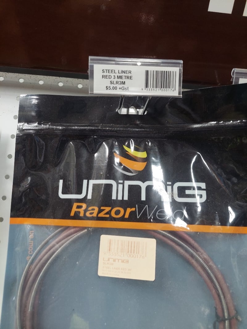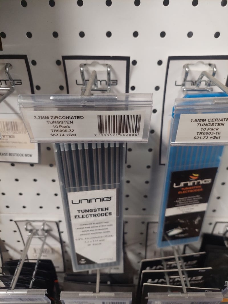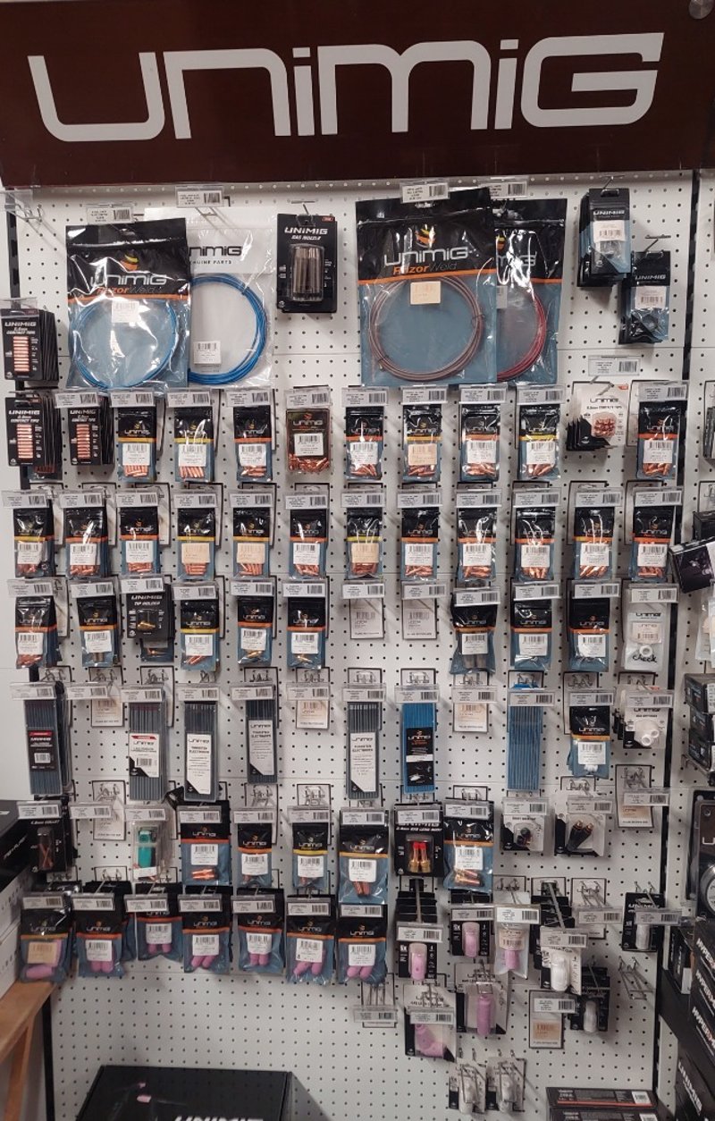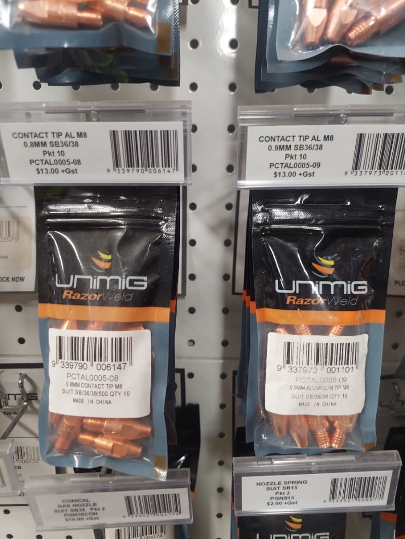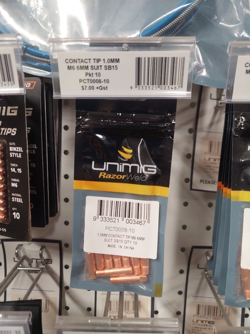 Comprehensive retail pegboard featuring UNIMIG Razor Weld welding consumables and accessories. The display includes contact tips (1.0mm, 0.8mm, 0.9mm variants for M6, M8 thread sizes), steel liners (3-metre length), nozzles, and tungsten electrodes (1.6mm and 3.2mm zirconiated/ceriated variants) and more ......All items remain factory-sealed in original packaging.