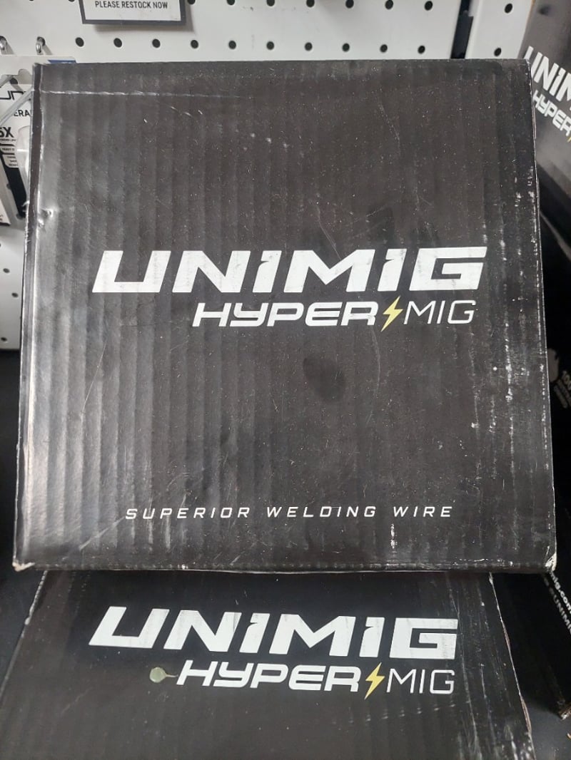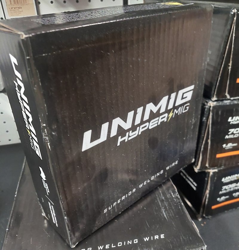 Unimig Hyper MIG superior welding wire, 70S-6 mild steel, 0.8mm diameter, 5kg spool. Copper-coated solid MIG wire. Note: untested
