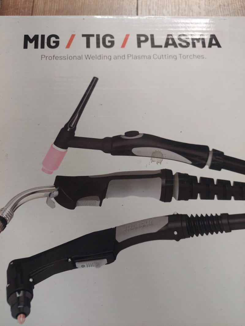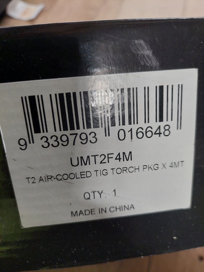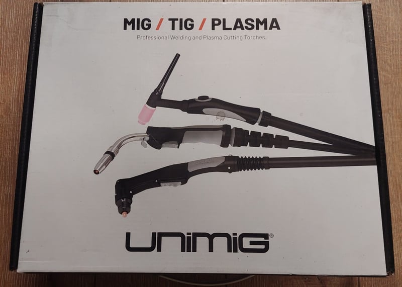Unimig professional welding torch package featuring MIG/TIG/Plasma capability. Model UMT2F4M T2 air-cooled TIG torch with 4-meter cable assembly.