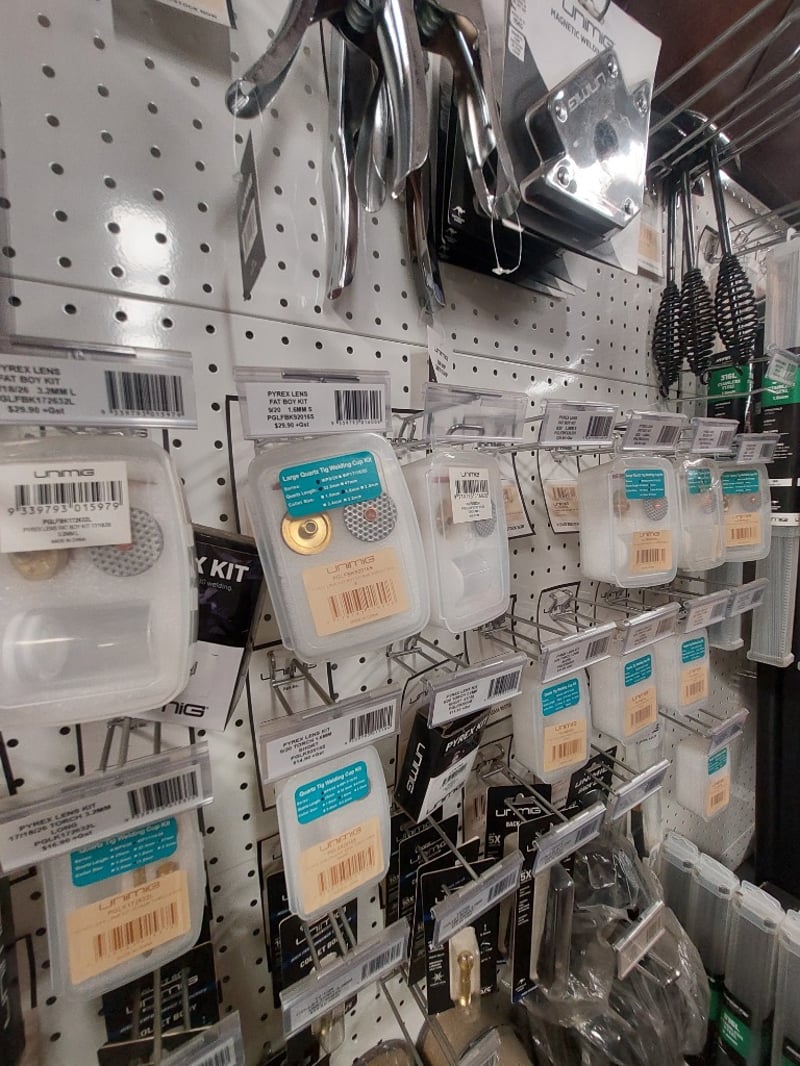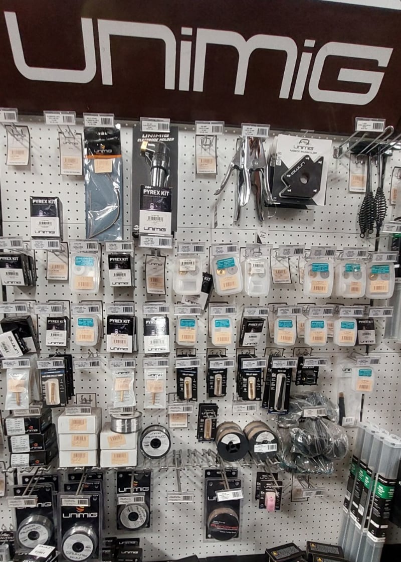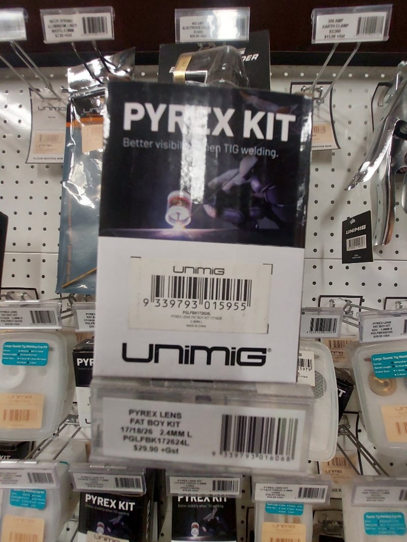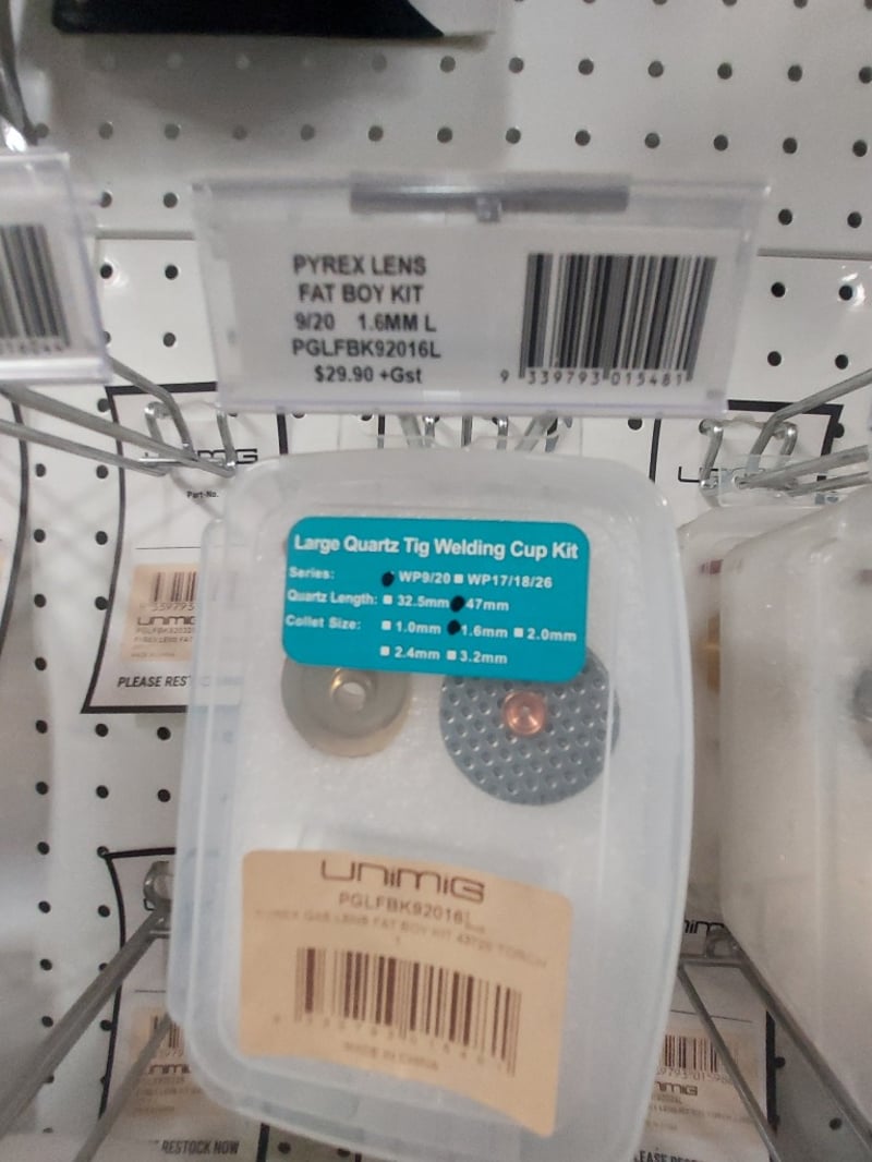 Unimig welding accessories and consumables display lot featuring Pyrex lens fat boy kits (1.6mm L, 2.4mm L), large quartz TIG welding cup kits with multiple collat sizes (1.9mm, 2.4mm, 3.2mm) and more