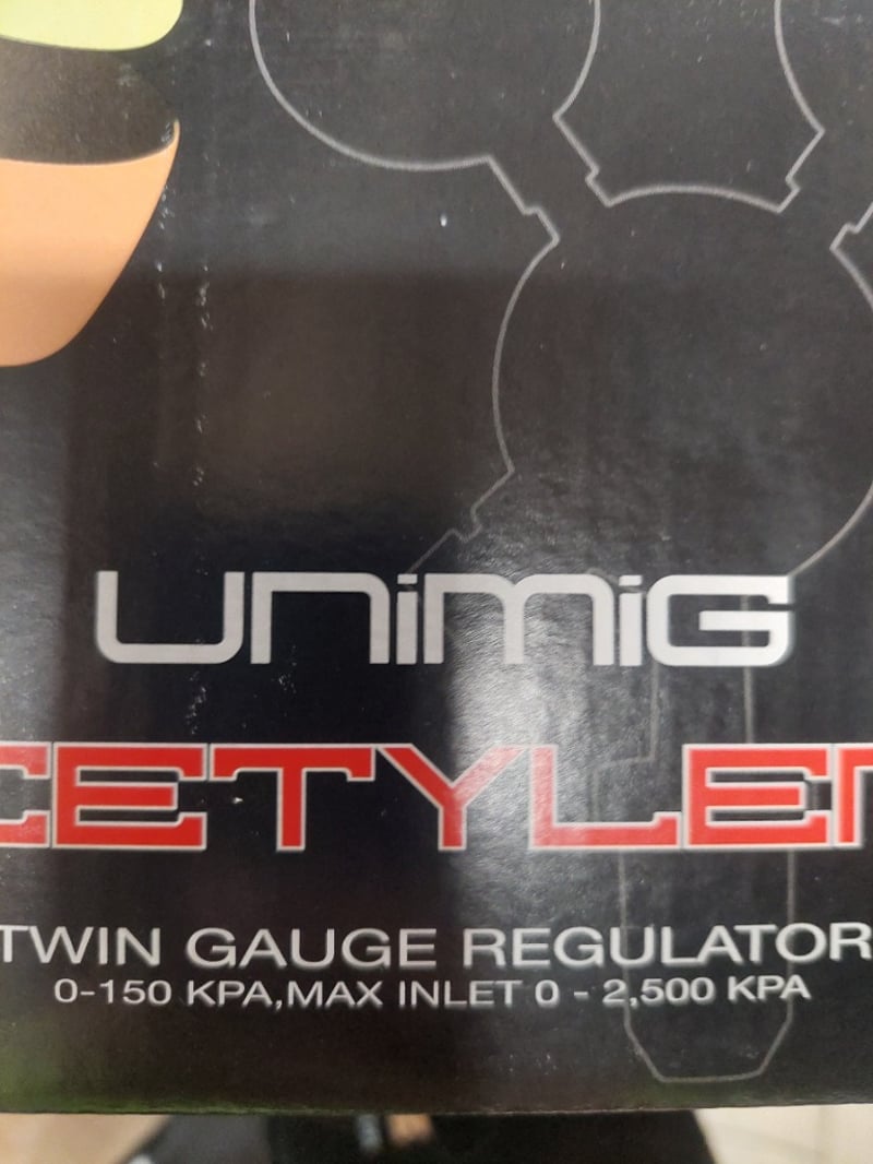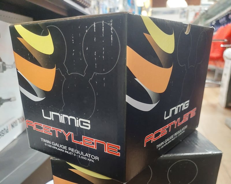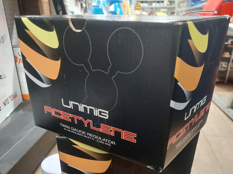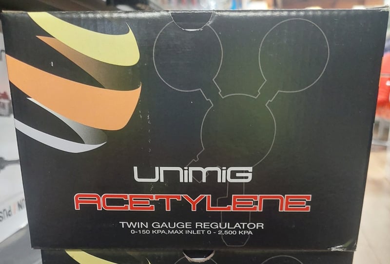 UNIMIG Acetylene Twin Gauge Regulator - professional-grade gas control equipment featuring dual pressure gauges for simultaneous monitoring.