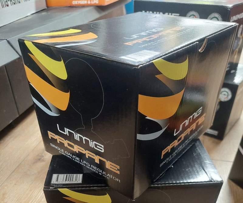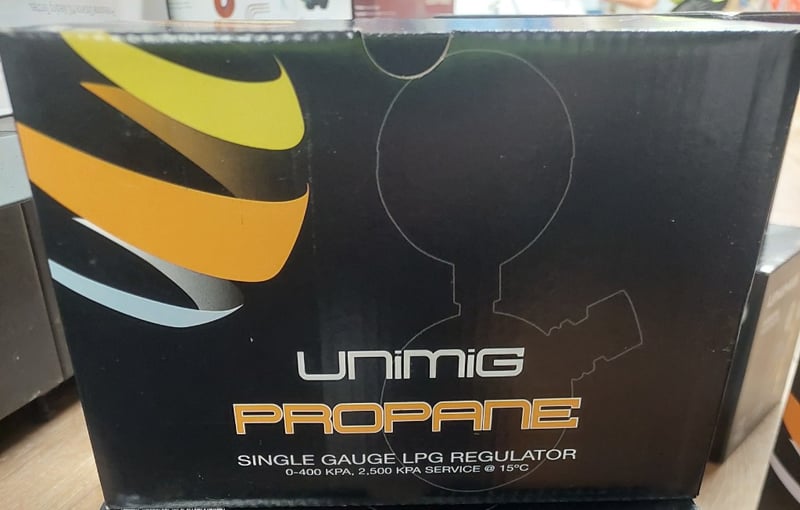 Unimig Propane Single Gauge LPG Regulator, rated 0-400 KPA with 2,500 KPA service capacity at 15°C.