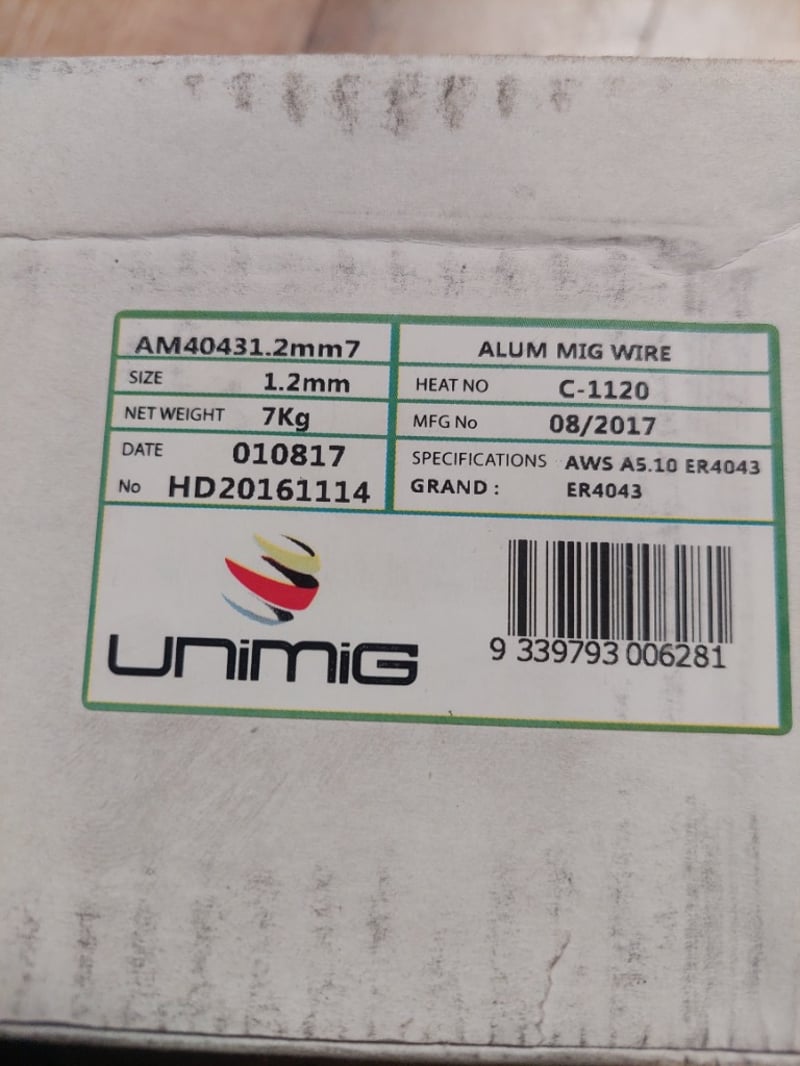 Unimig aluminium MIG welding wire spool. Model AM40431.2mm7 featuring 1.2mm diameter wire.
