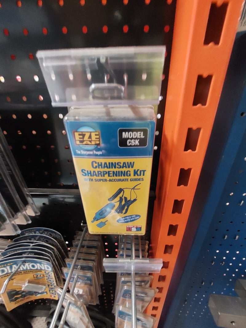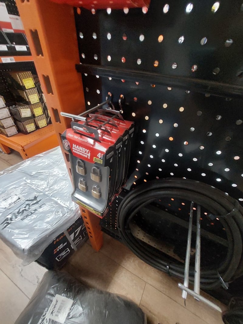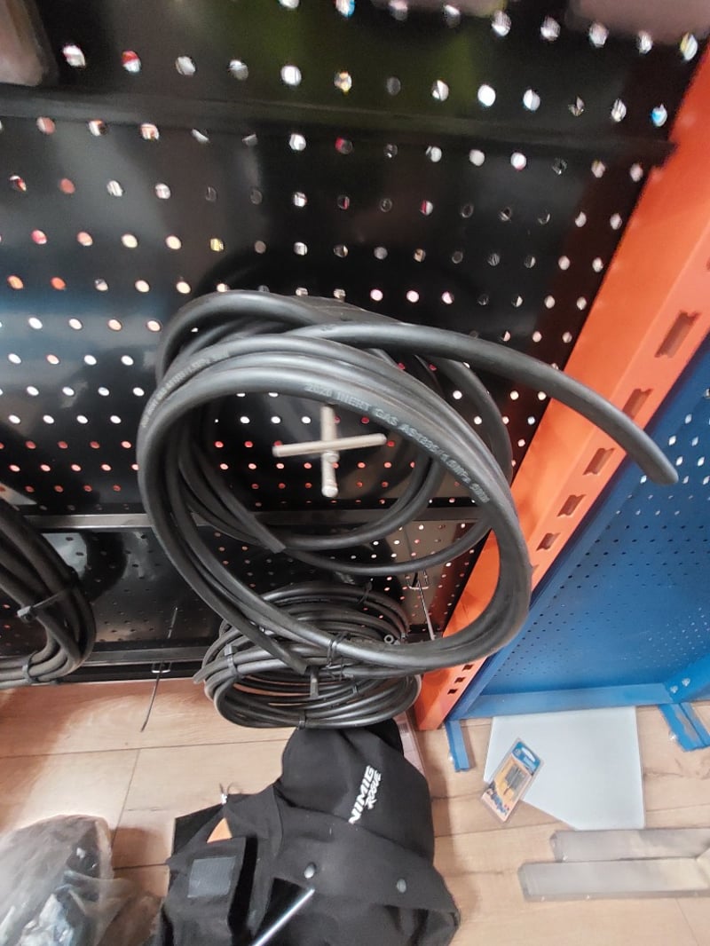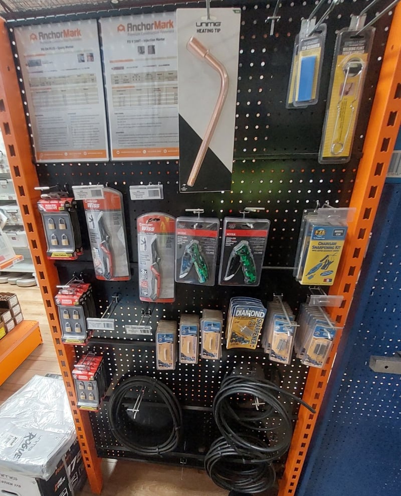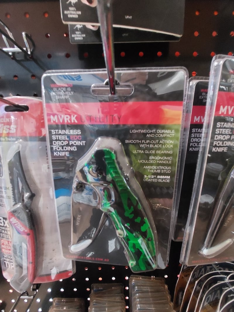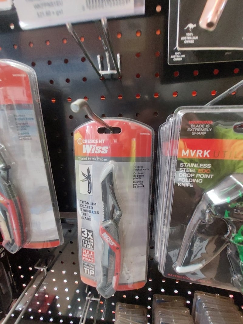 Comprehensive hardware and tools display shelf lot featuring welding and construction supplies. Unimig heating tip (copper), various folding pocket knives (Crescent Wiss, MVRK brand in green/black), EZE chainsaw sharpening kit (Model CSK) with super-accurate guides, stainless steel drop-point folding knives with ergonomic moulded handles and blade locks, welding cables (approximately 10-15 meters of black insulated cable coiled), padlocks (Handy brand 4-pack), and more .... Sold as Lot Brand New- Unopened