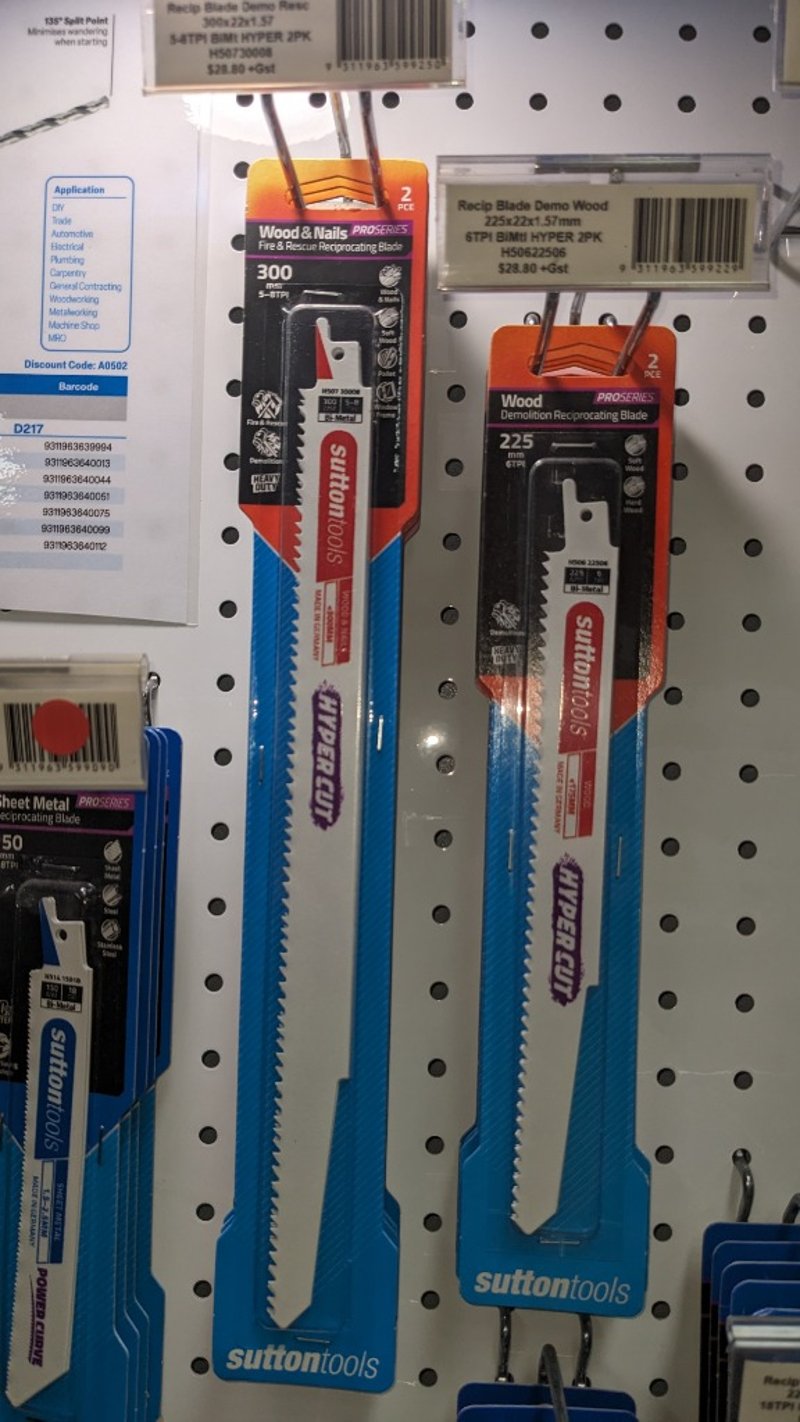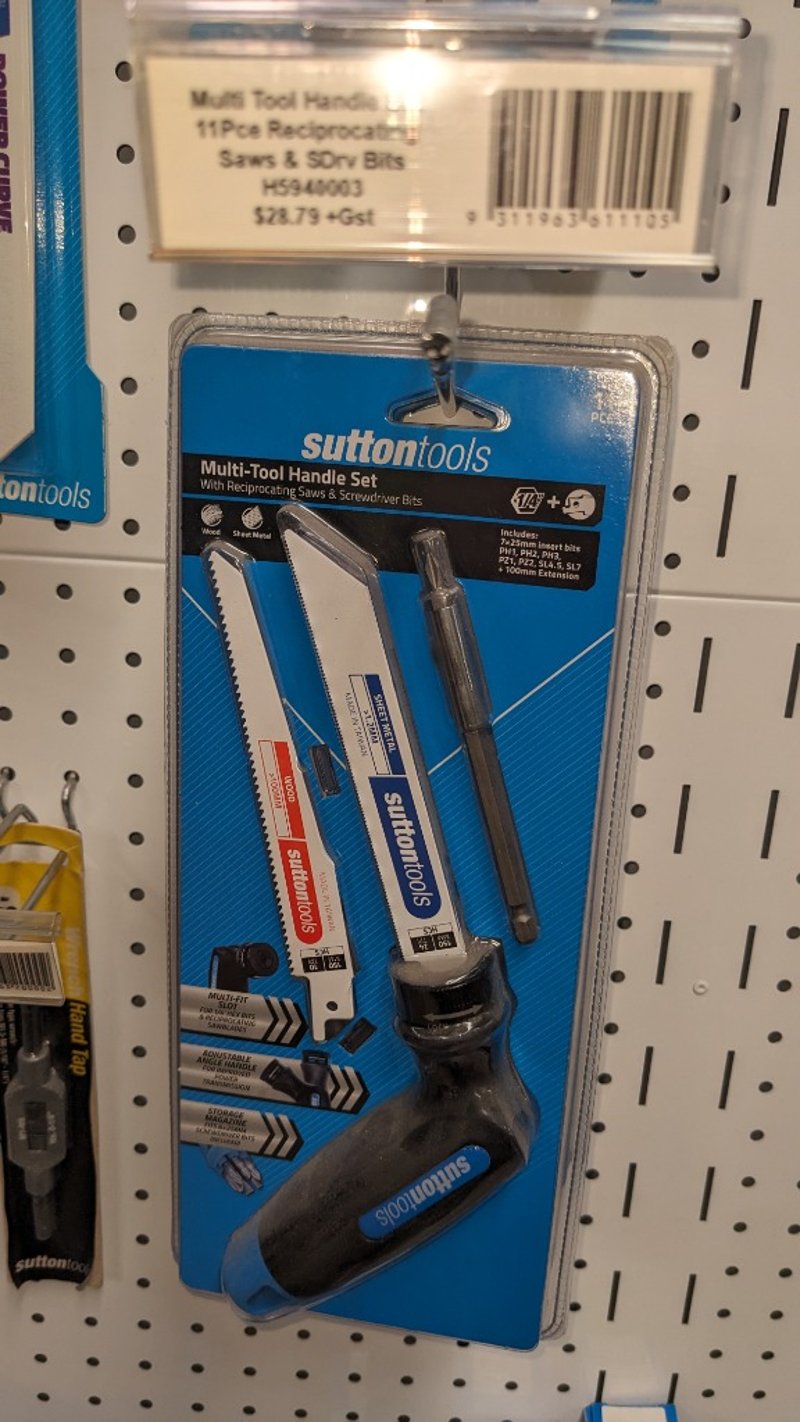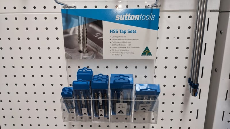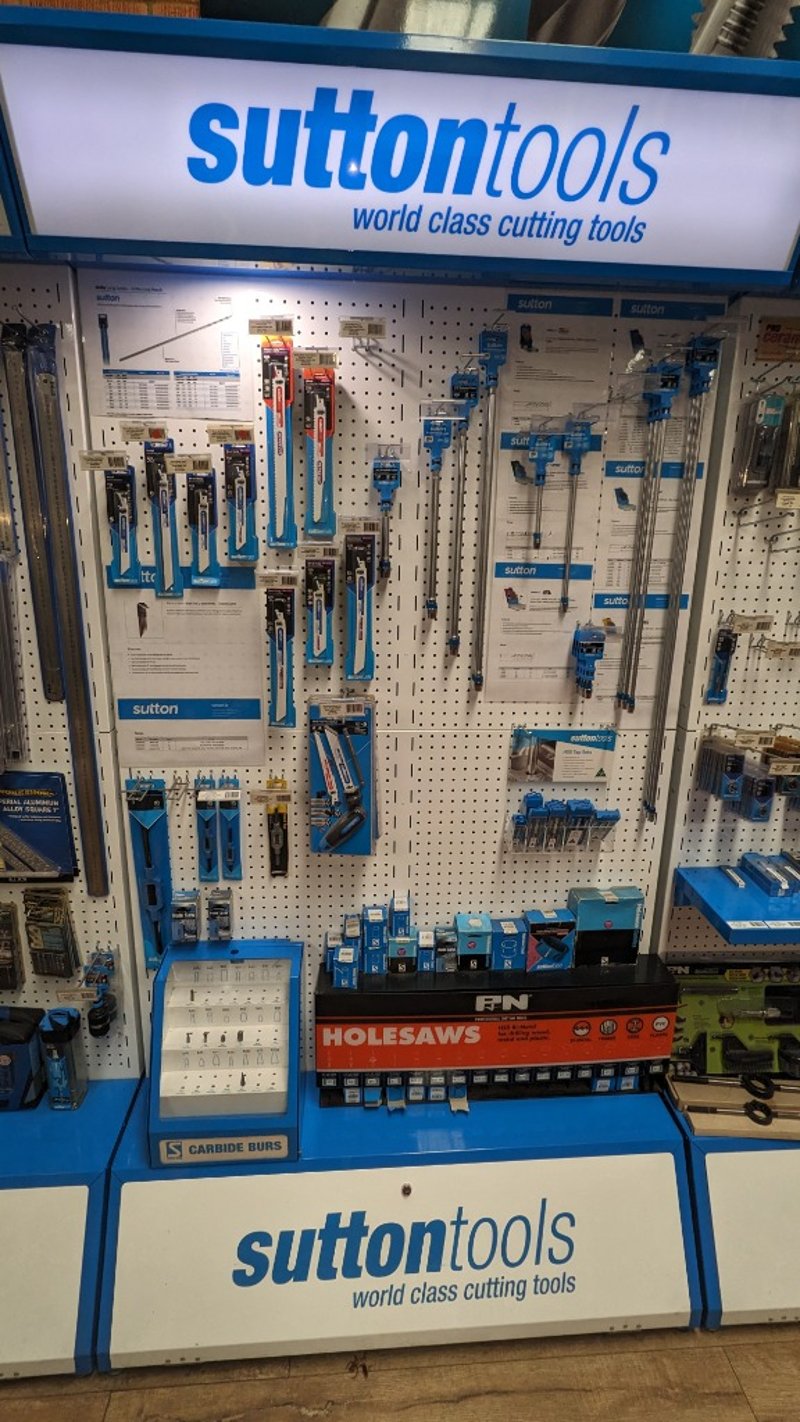 Comprehensive Sutton Tools cutting implements collection featuring professional-grade hand tools and accessories. Includes multi-tool handle set with reciprocating saws and screwdriver bits (11-piece set, $28.79 +GST), wood and nails reciprocating blades in 300 and 225 tooth configurations (PRO series), sheet metal cutting blades, HSS tap sets for general purpose hand and machine operations with depths up to 1.5mm, suitable for materials up to 160Nm/mm2, and various carbide burr attachments. Complete display stock from hardware retail environment showcasing Sutton Tools' "world class cutting tools" product range. All items new in original packaging and display condition. Sold as Lot