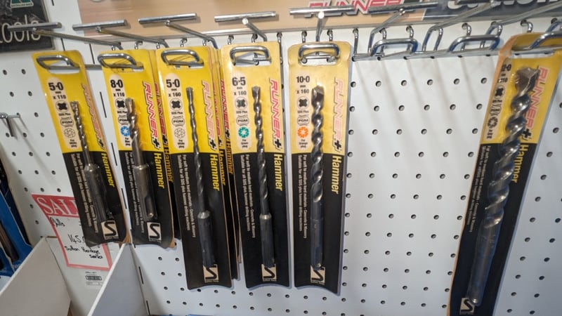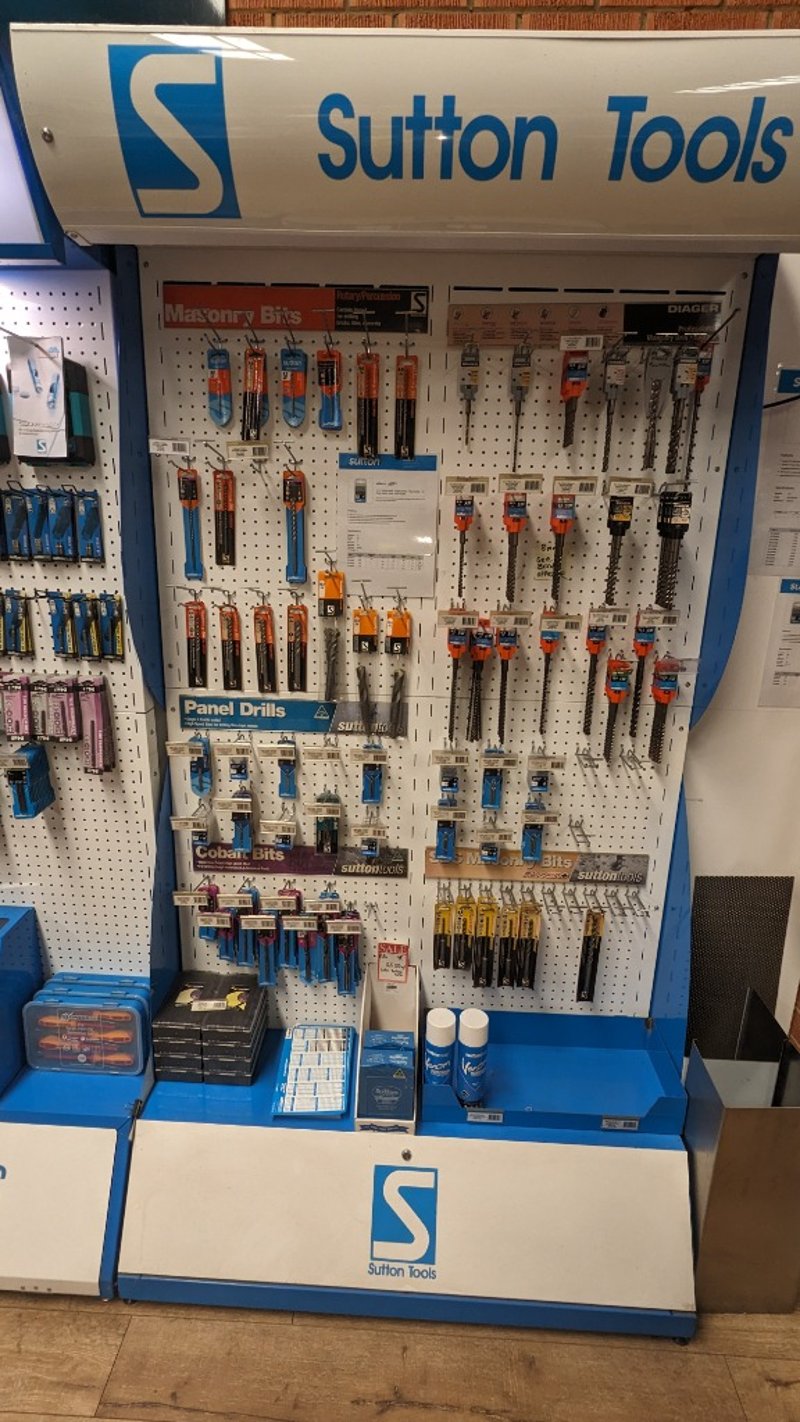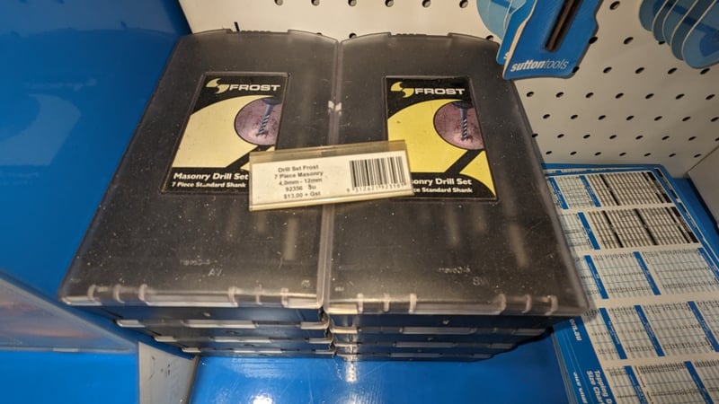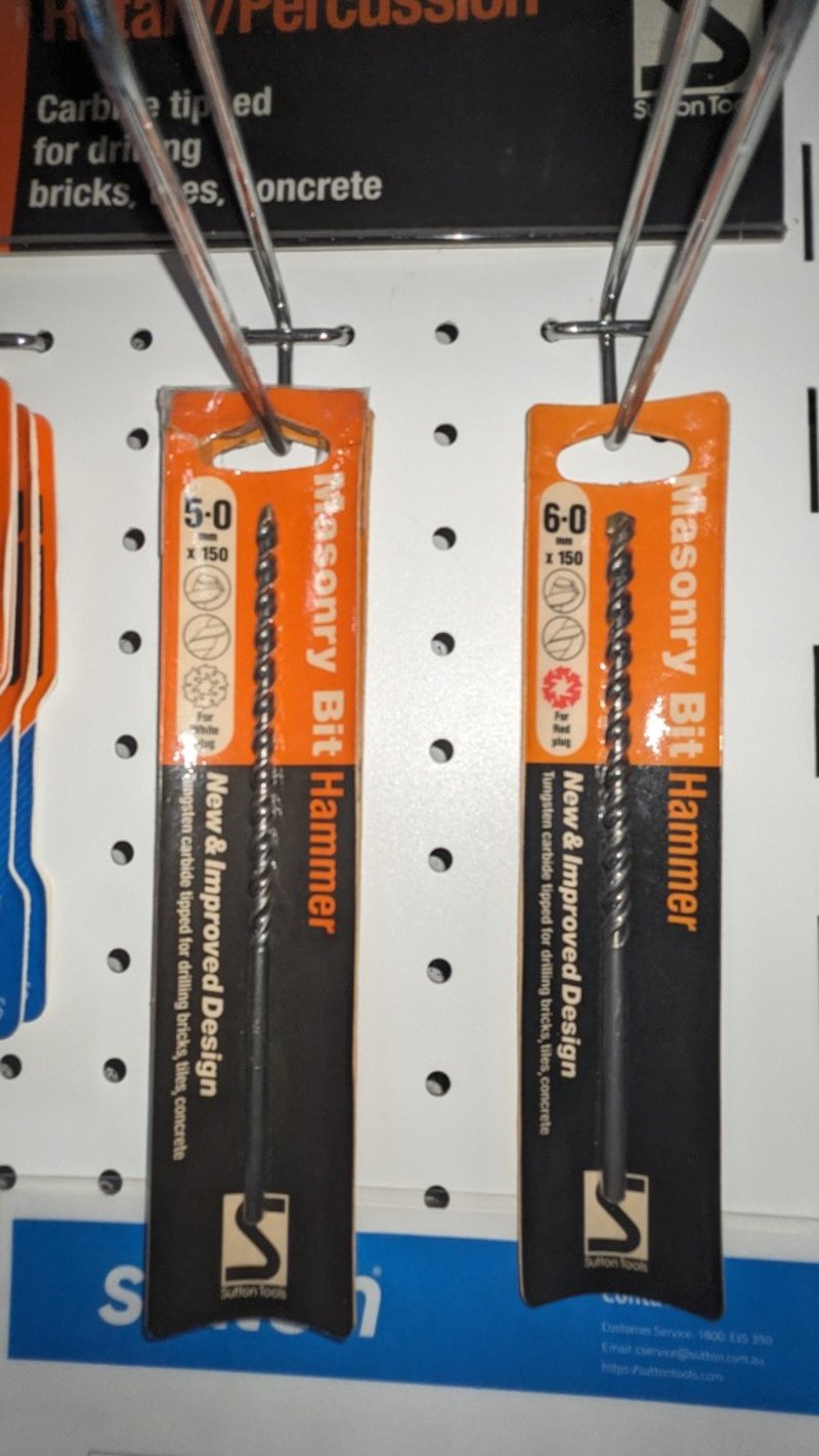 Comprehensive Sutton Tools masonry and percussion drill bit assortment featuring two Frost brand masonry drill sets in protective cases, multiple Hammer brand SDS Plus percussion drill bits in various sizes (5.0mm through 10.0mm), and organized pegboard display stock. Includes yellow and black packaged drill bits with standard shanks, precision-engineered carbide-tipped designs suitable for drilling into bricks, tiles, and concrete. Professional-grade tooling from established Australian supplier Sutton Tools, displayed on blue and white retail pegboard with product information cards. Stock appears well-maintained with original packaging intact.
