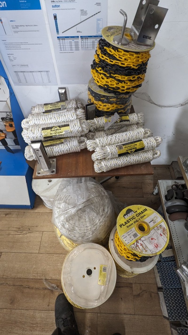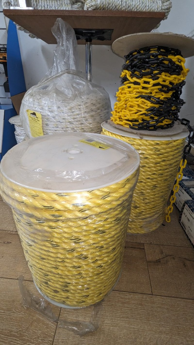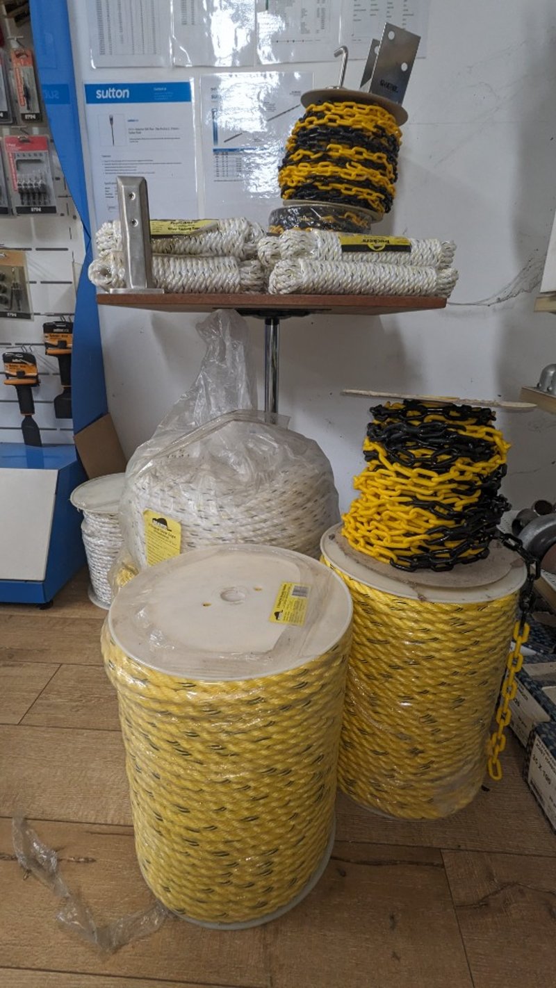 Comprehensive rope and chain display lot featuring multiple industrial-grade products from Sutton and Beaver brands. Includes substantial stock of white polypropylene rope in various gauges wound on large plastic spools, yellow and black plastic chain coils stacked on metal frames, and white 3-strand silver rope (polyethylene).