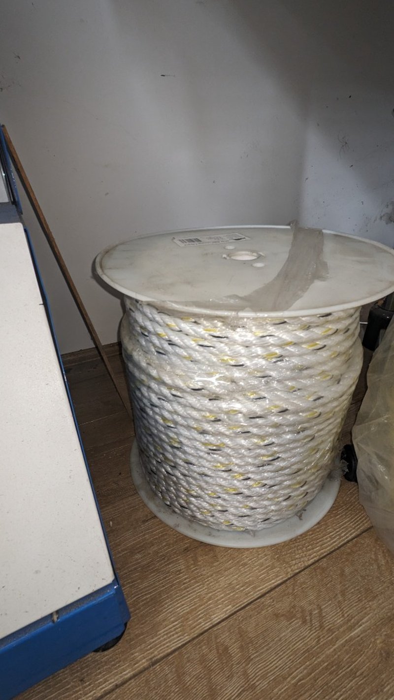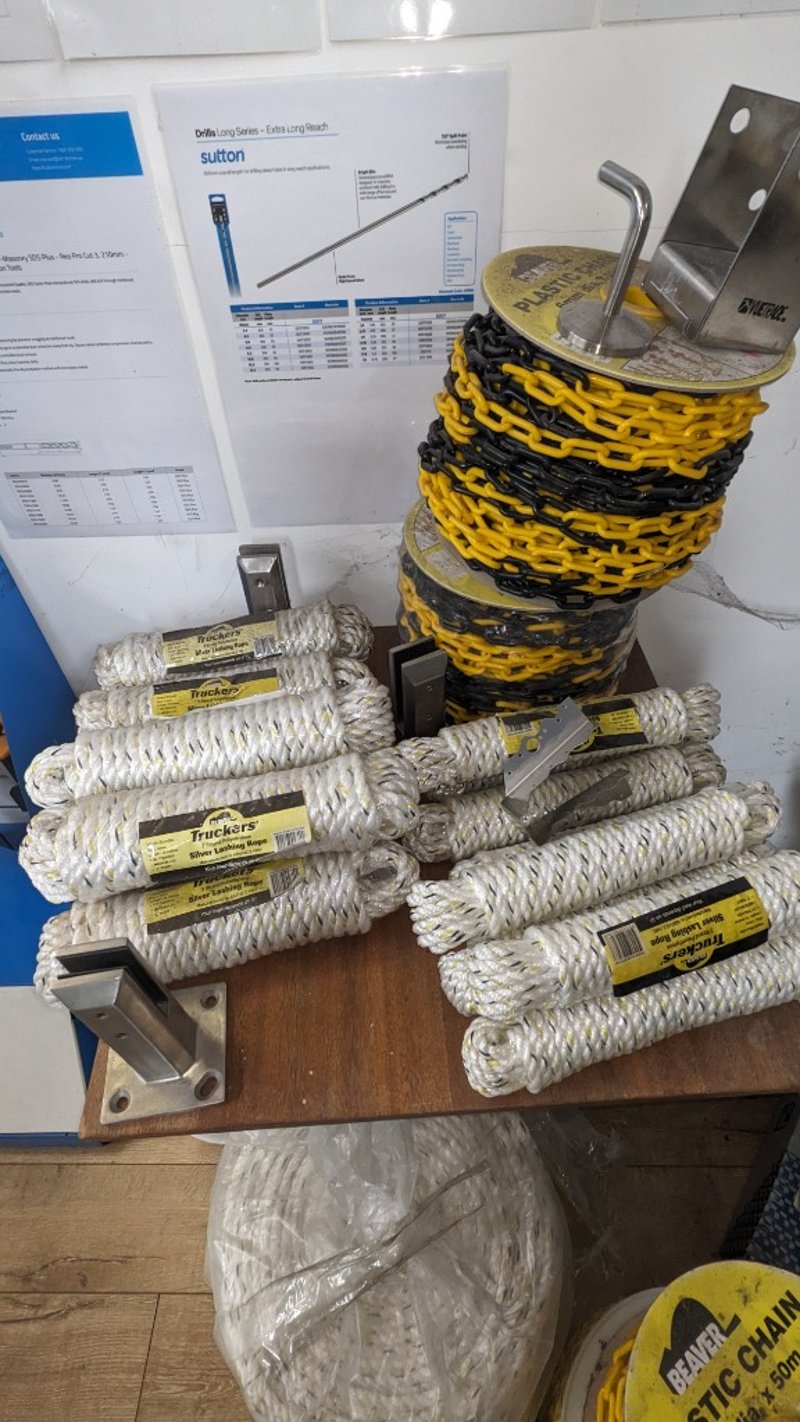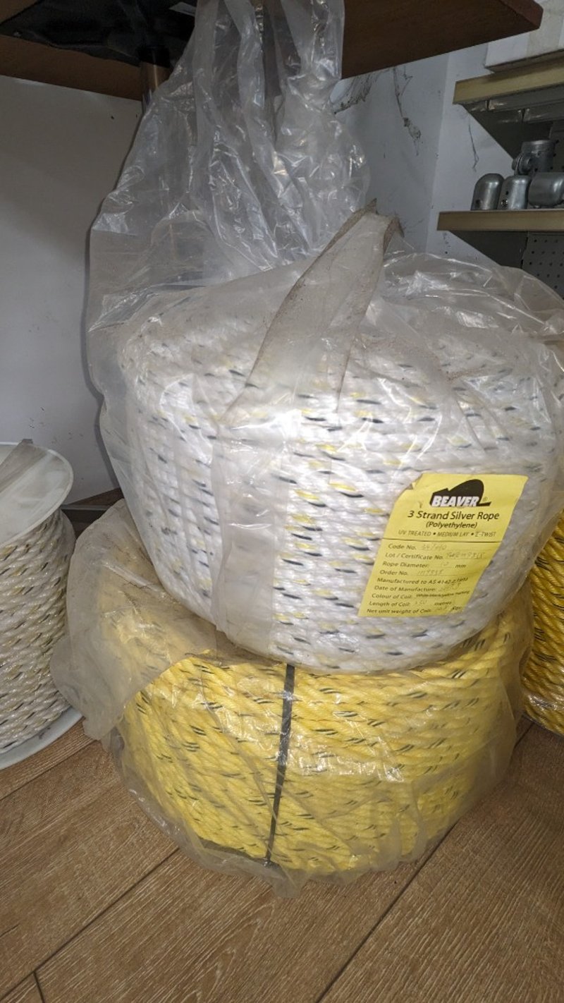 Comprehensive rope and chain display lot featuring multiple industrial-grade products from Sutton and Beaver brands. Includes substantial stock of white polypropylene rope in various gauges wound on large plastic spools, yellow and black plastic chain coils stacked on metal frames, and white 3-strand silver rope (polyethylene).