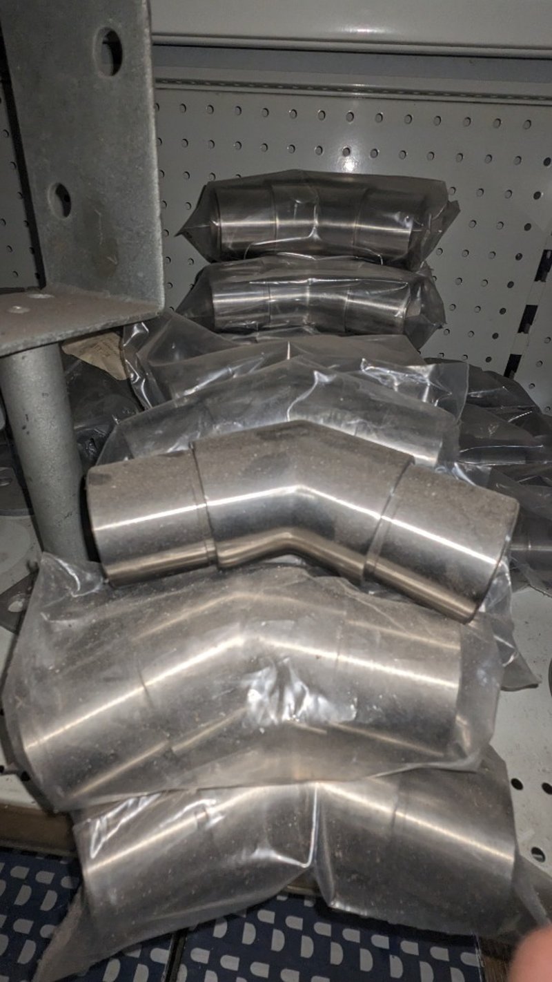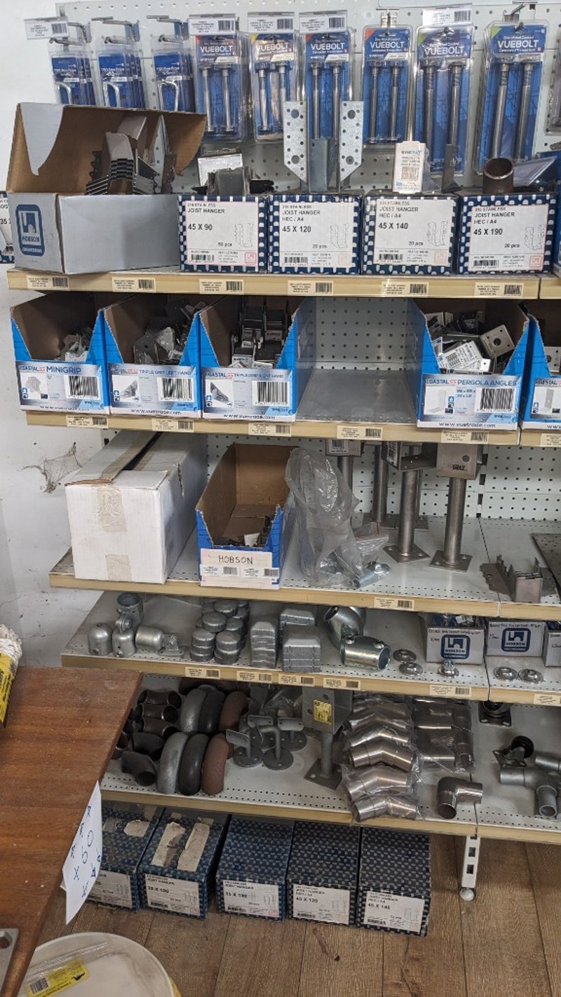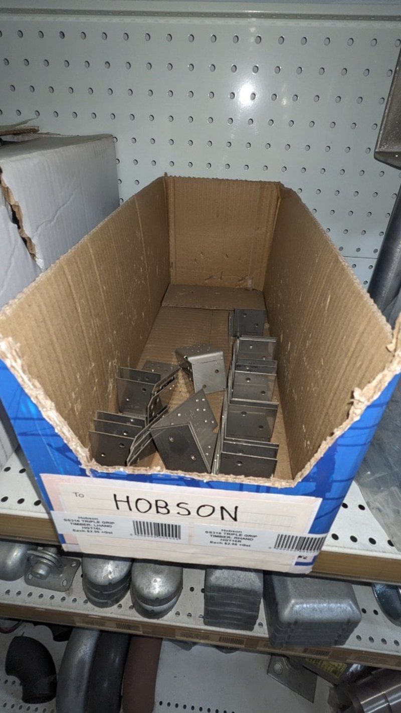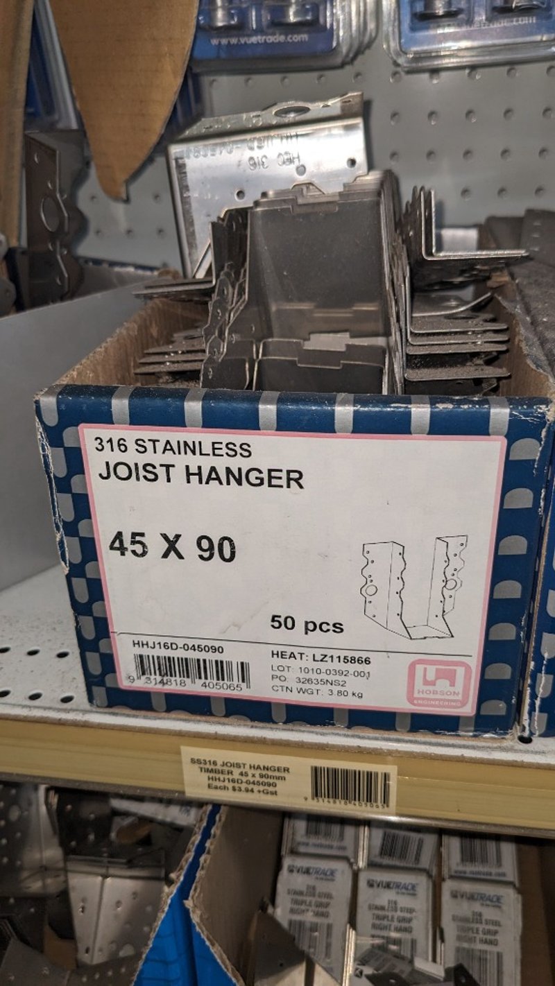 Bulk lot of stainless steel building hardware and fittings comprising 316 stainless steel joist hangers (45 x 90mm, 50 pieces per box), galvanised steel elbow bends, tee connectors, and miscellaneous plumbing/structural fittings. Stock includes packaged Vuebolt fastening systems, Hobson branded components, and various sized metal connectors and brackets. Mixed inventory appears to be surplus retail stock from hardware/building supply store shelving.