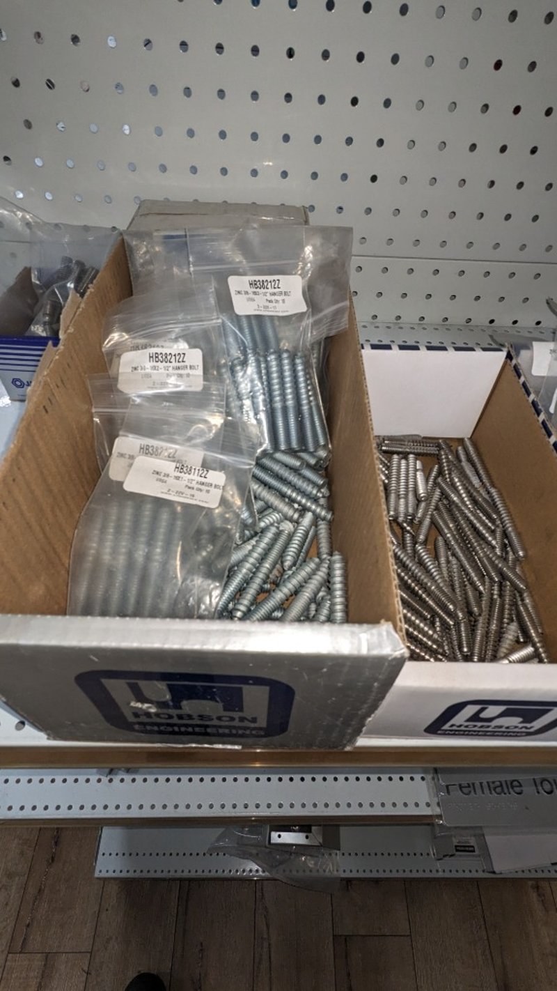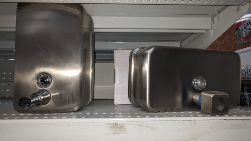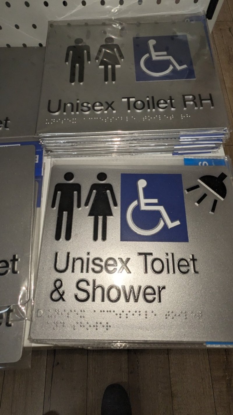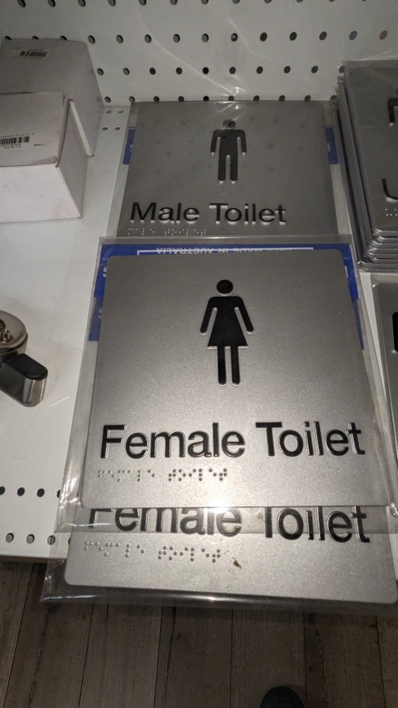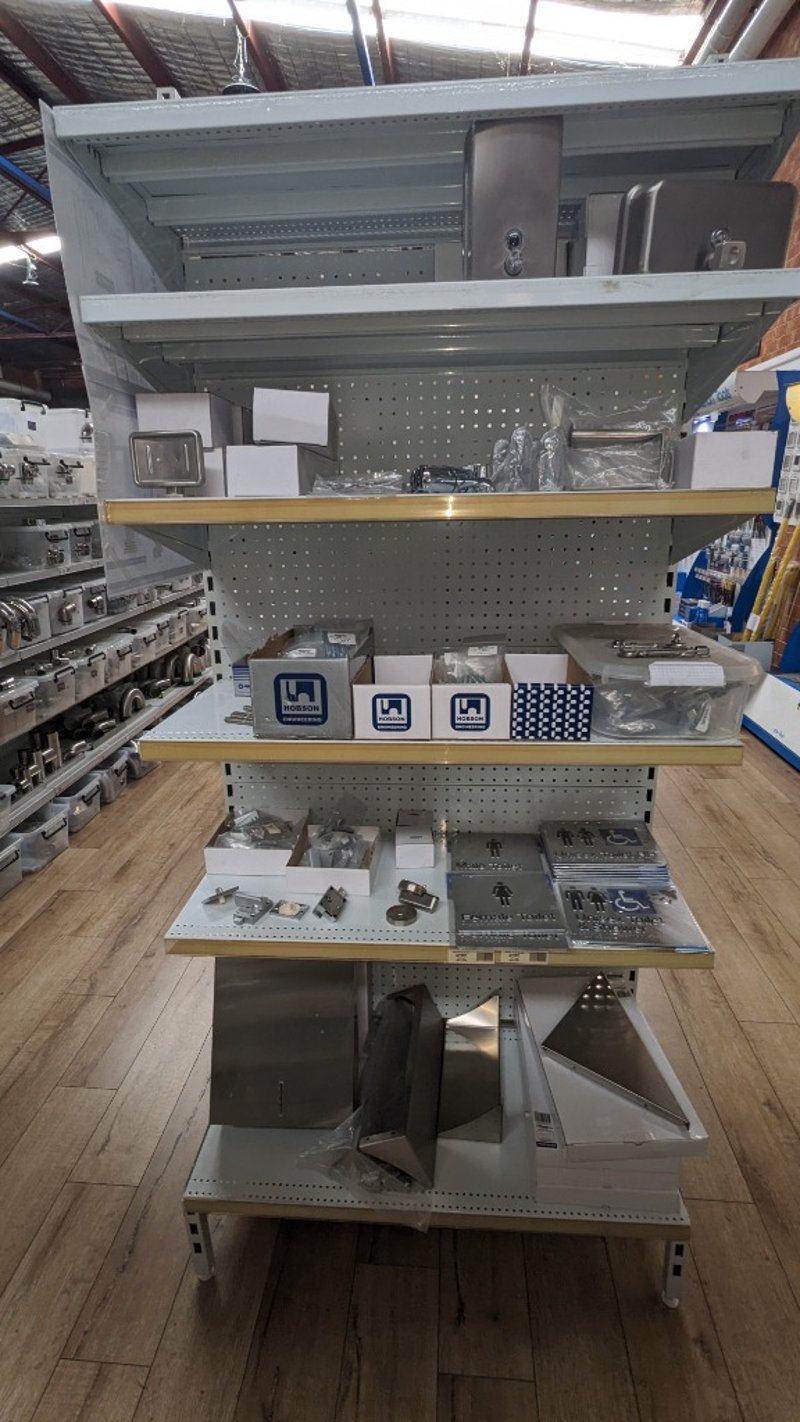 Lot of stainless steel signage and hardware including male, female, and unisex toilet signs (with braille), wall-mounted dispensers, screws, and assorted fittings. Mixed items stored on shelving with visible variation in size and design. Sold as Lot Note: Untested / As Displayed