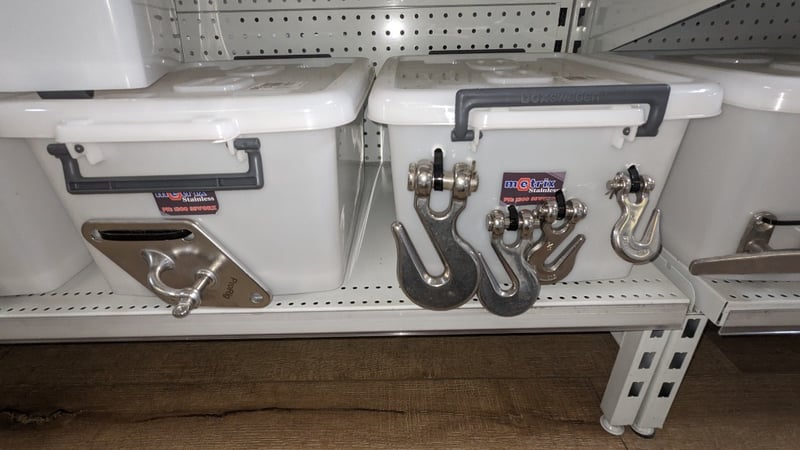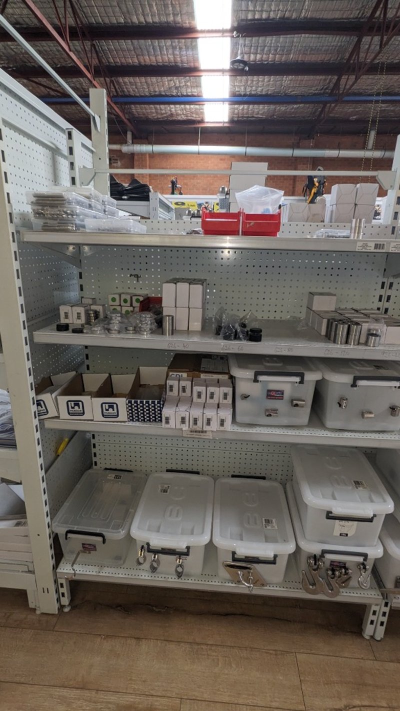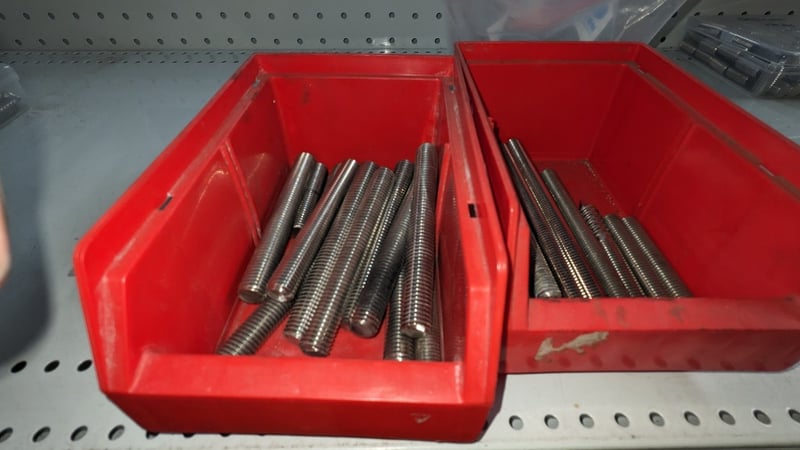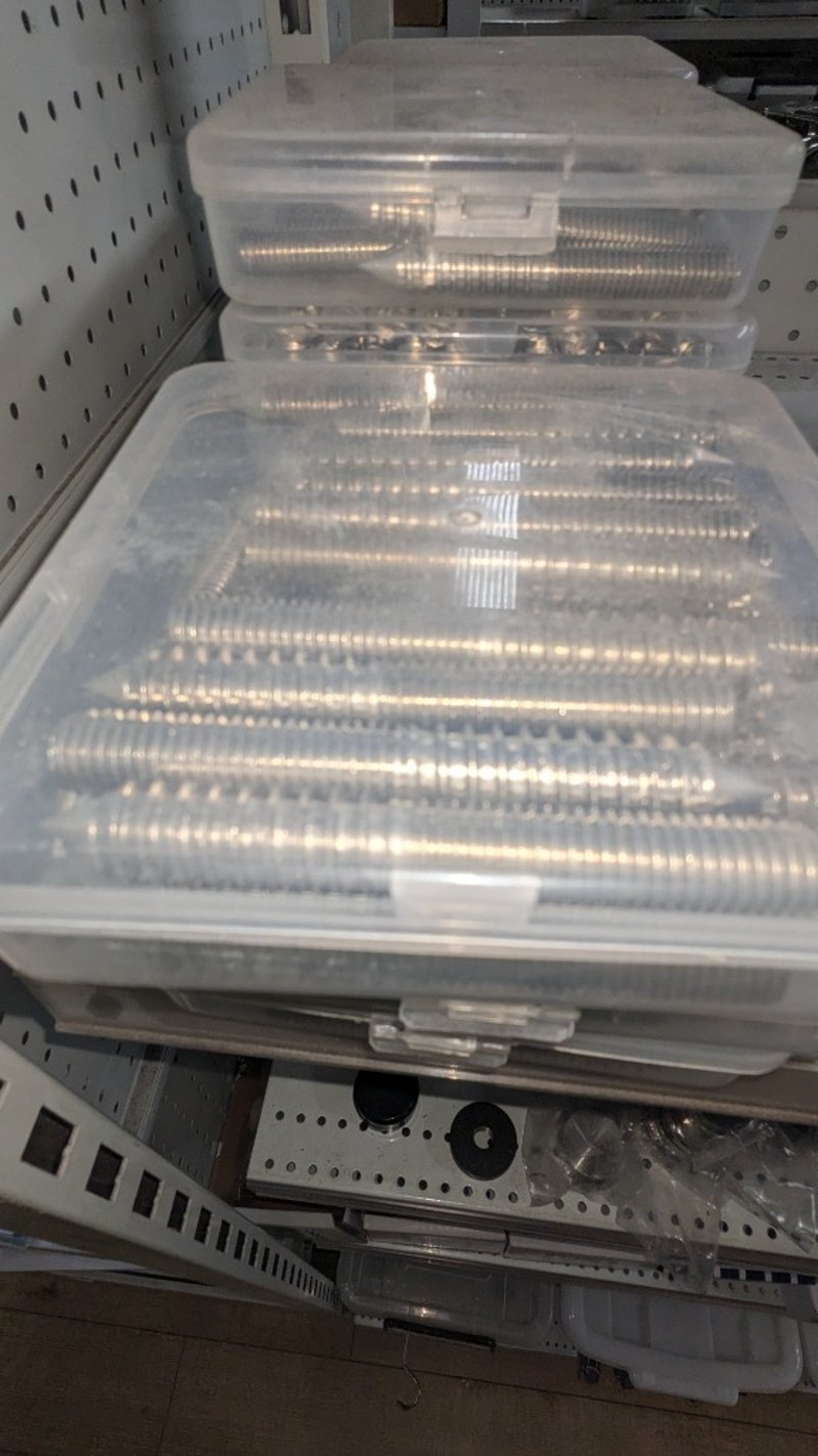 Lot of stainless steel threaded rods, bolts, and assorted hardware components stored in plastic containers and bins. Multiple units with visible variation in length, diameter, and configuration. Sold as Lot Note: Untested / As Displayed