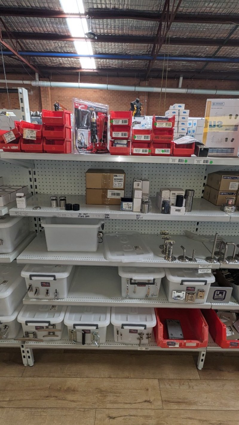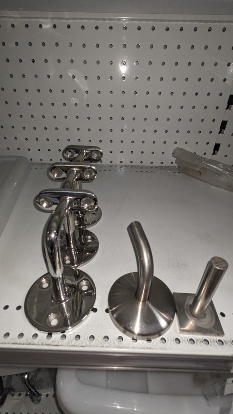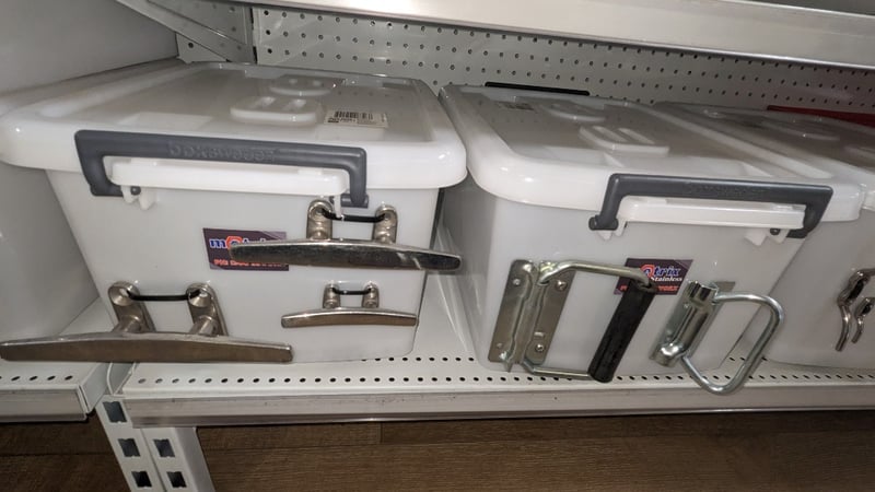 Lot of assorted stainless steel hardware including rivet nut drill adaptor kits (M3–M6), handrail fittings, brackets, hooks, and mounting components. Items stored in original packaging and plastic containers with multiple units and visible variation in size and design. Sold as Lot Note: Untested / As Displayed