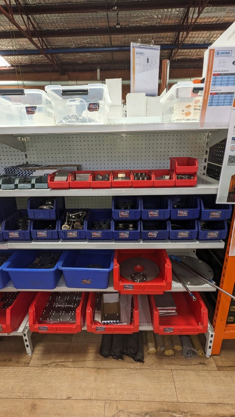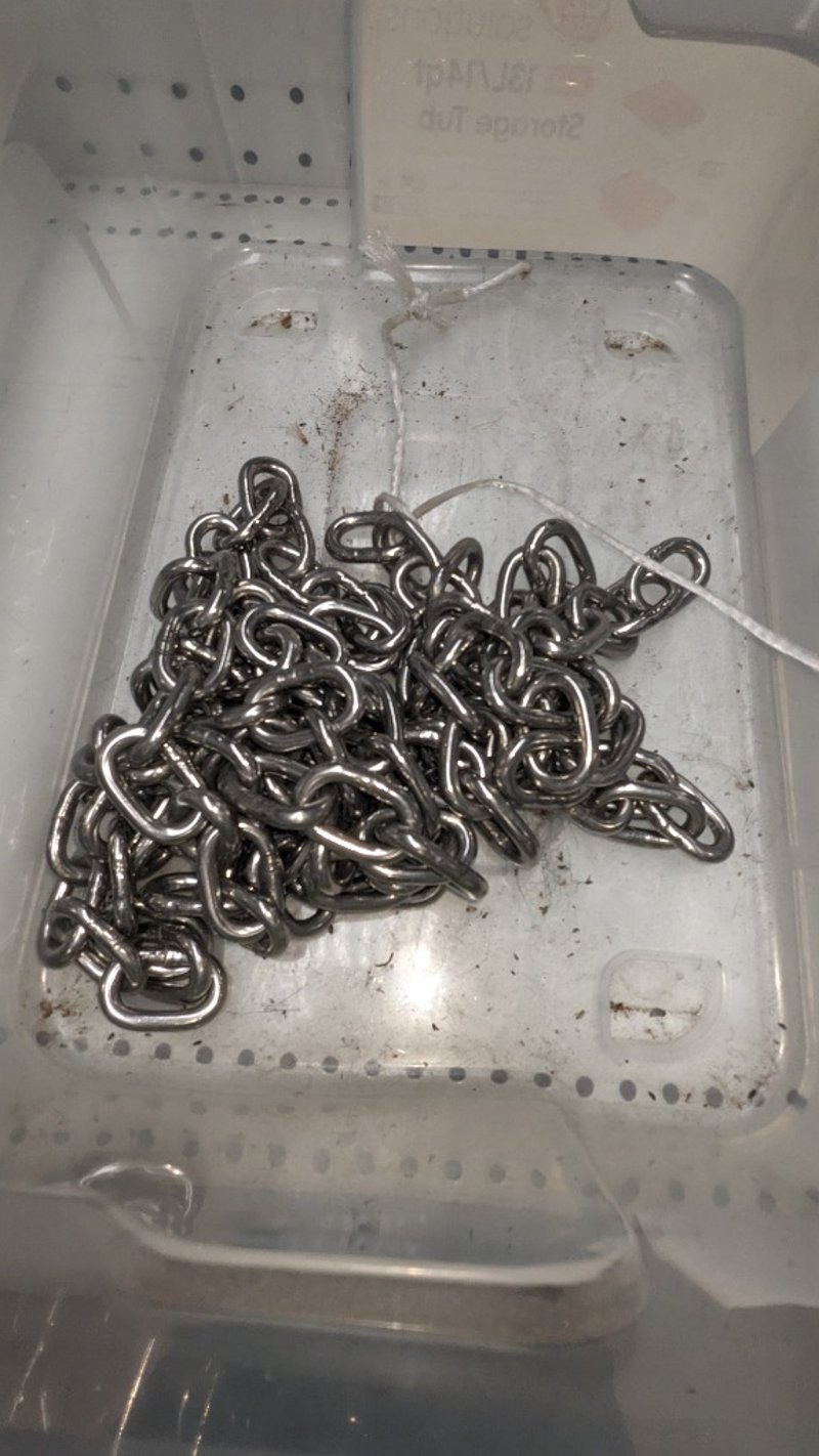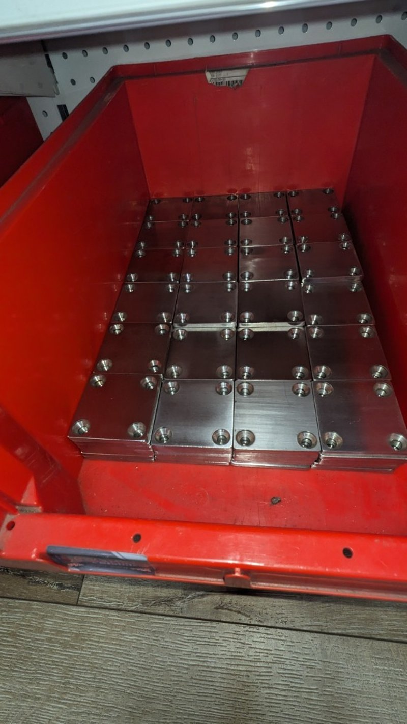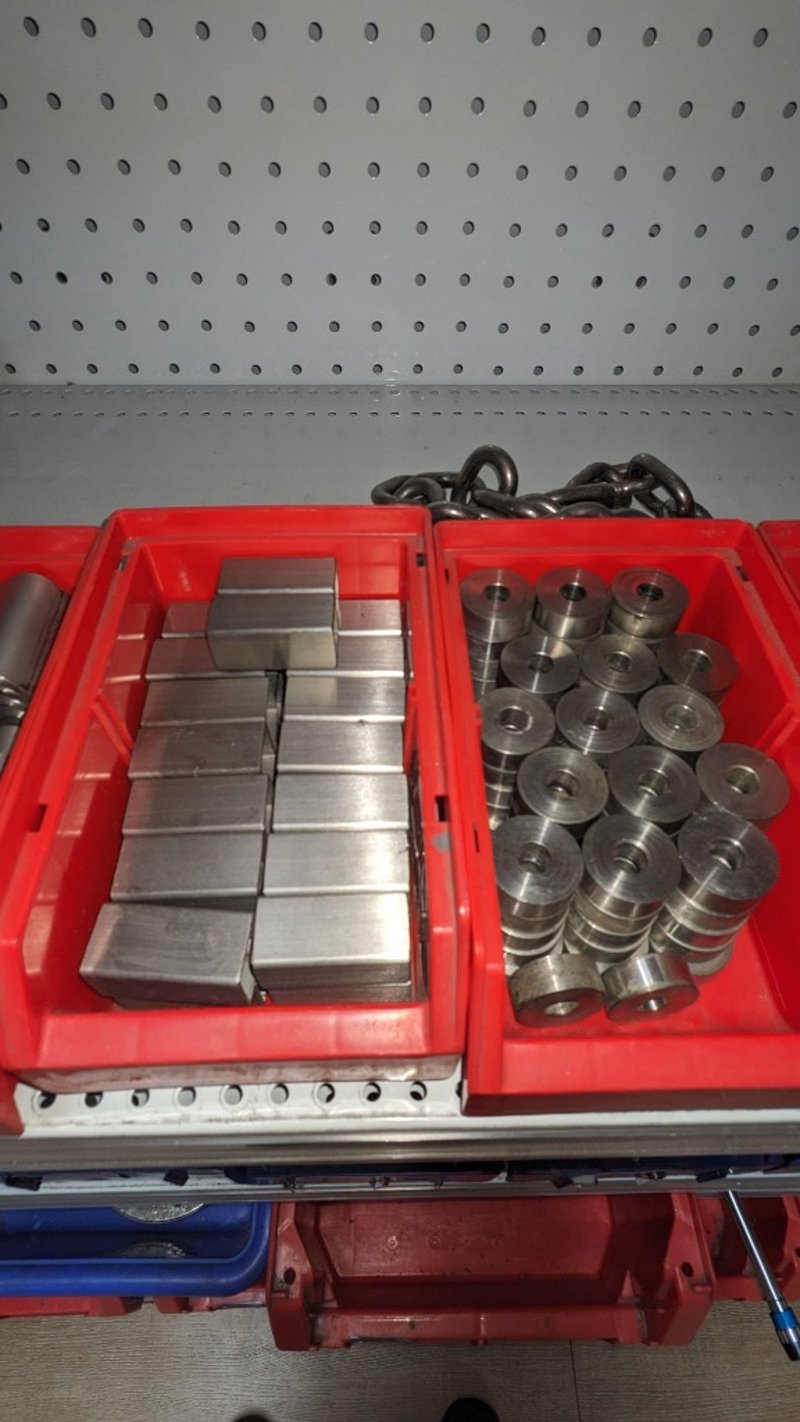Lot of assorted machined metal components including stainless steel plates, blocks, spacers, and cylindrical parts, along with chain links. Various sizes and configurations stored in plastic bins and shelving. Includes multiple units with visible variation in dimensions and finishes. Sold as Lot Note: Untested / As Displayed