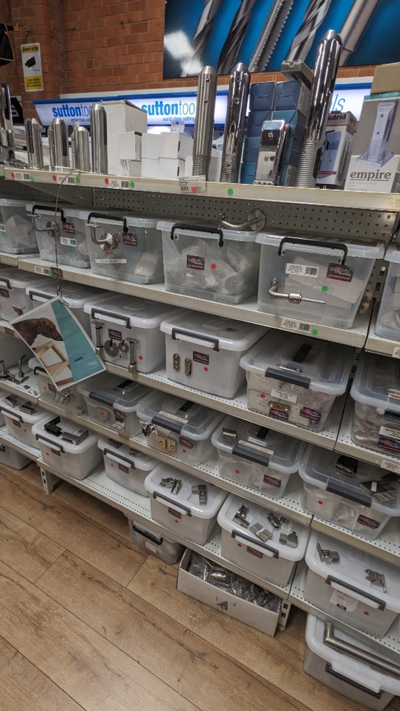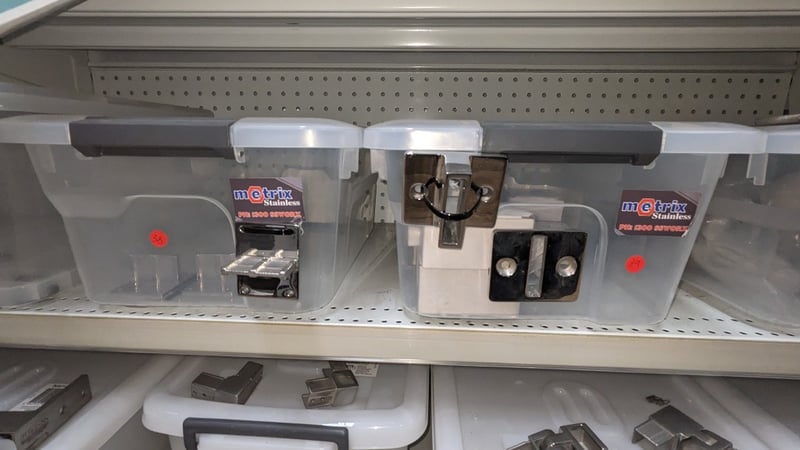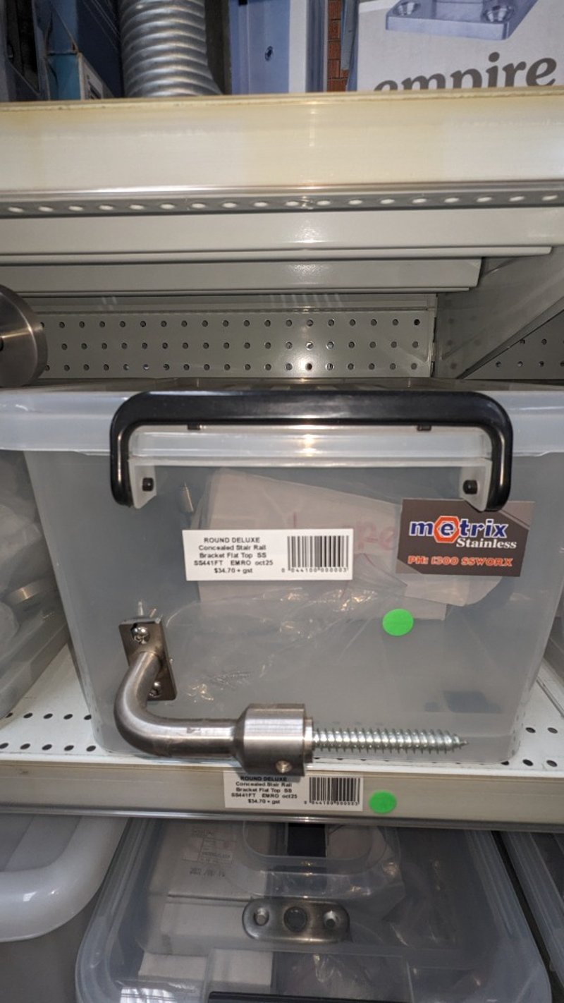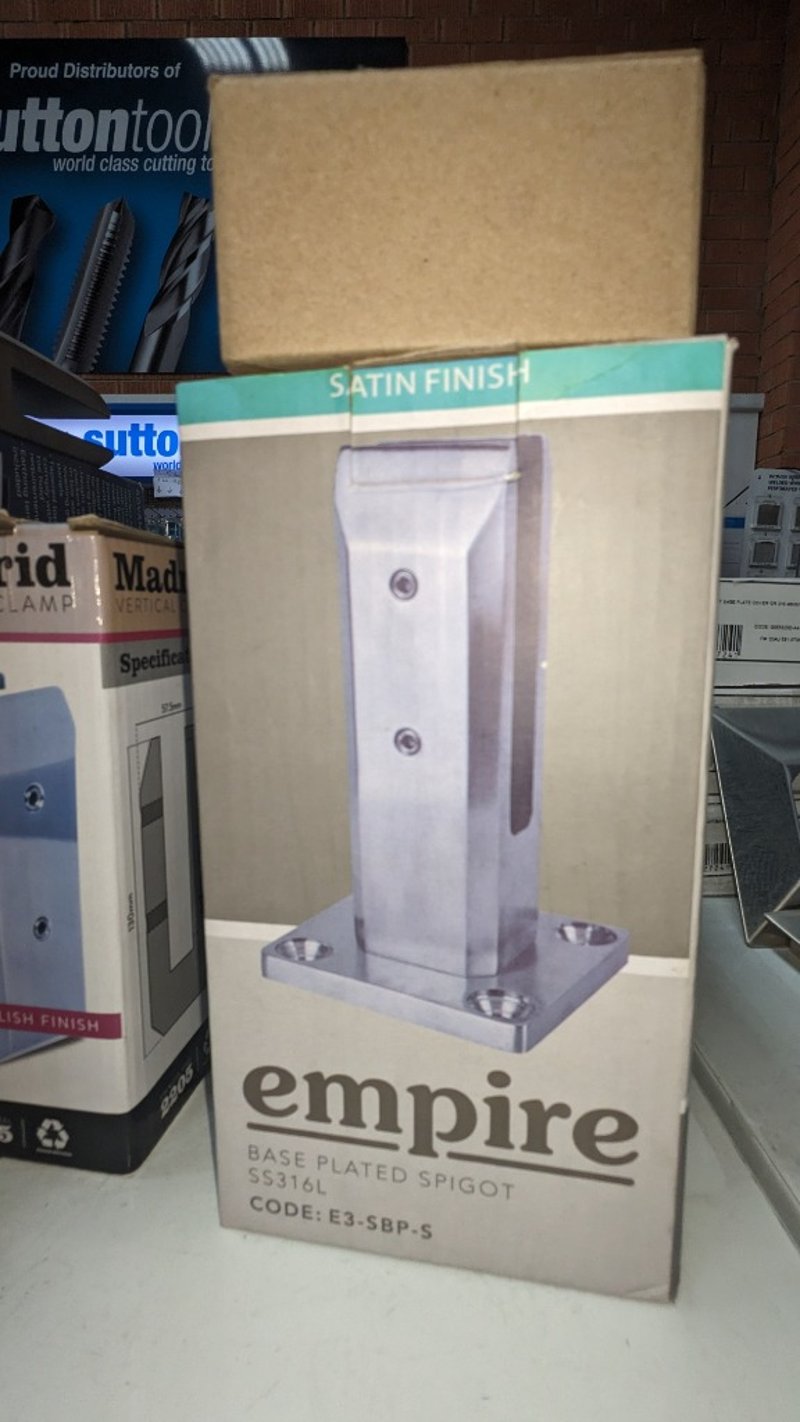 Lot of stainless steel balustrade hardware including base plate spigots (Empire SS316L), brackets, mounts, and assorted fittings stored in plastic containers. Multiple units with visible variation in size, design, and configuration. Sold as Lot Note: Untested / As Displayed