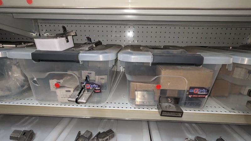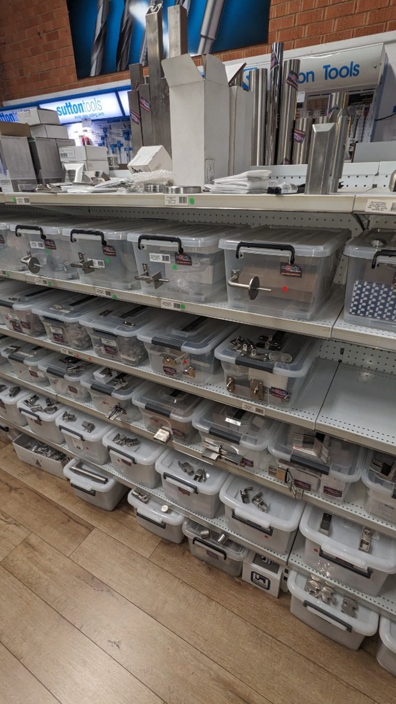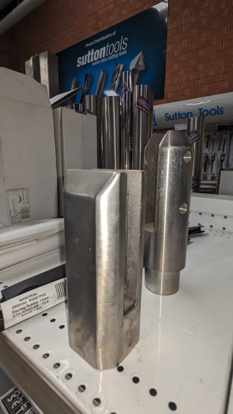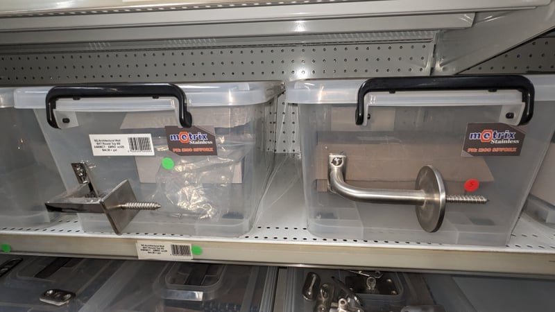 Lot of stainless steel balustrade hardware including base plate spigots (Empire SS316L), brackets, mounts, and assorted fittings stored in plastic containers. Multiple units with visible variation in size, design, and configuration. Sold as Lot Note: Untested / As Displaye
