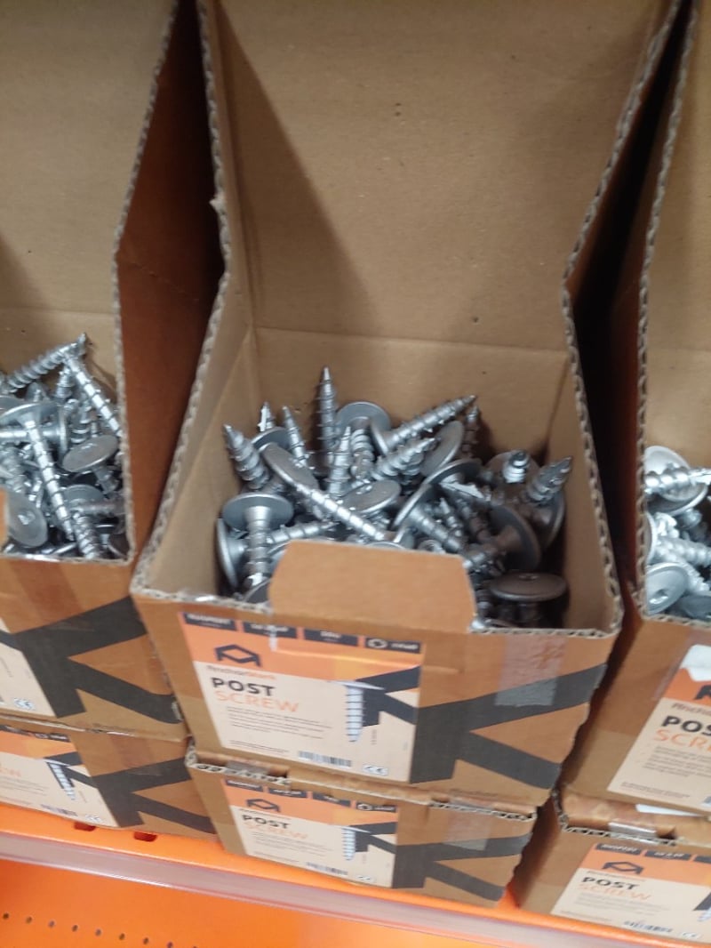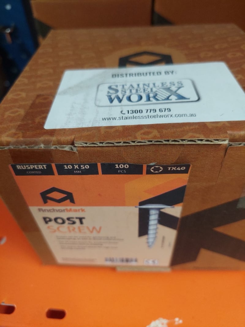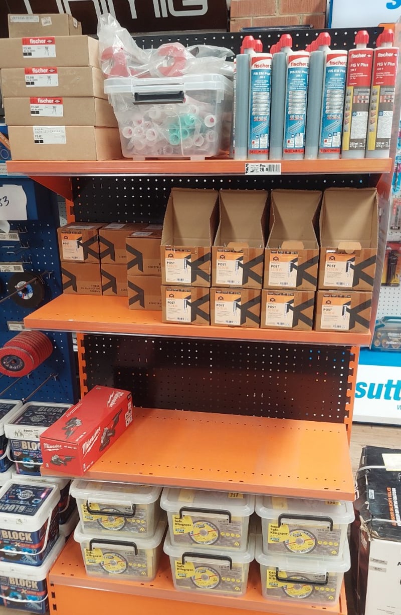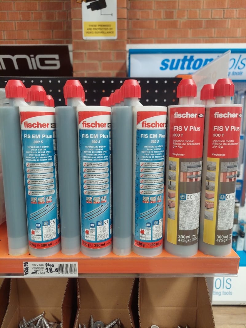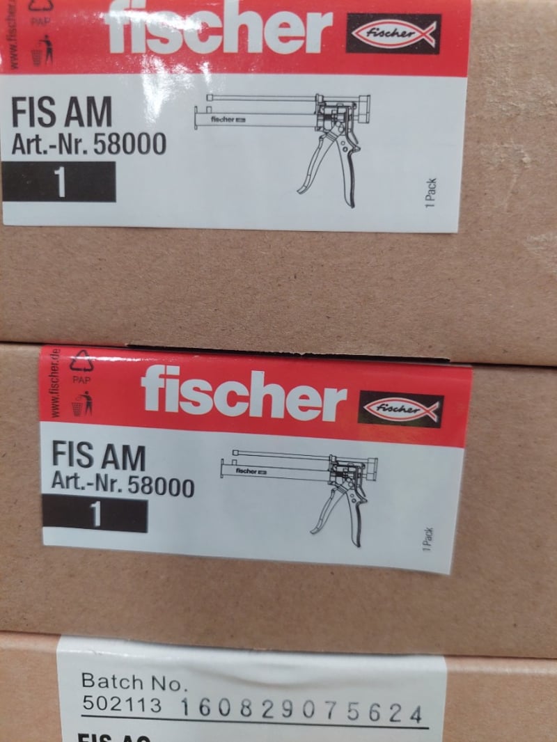 Builder's hardware and fasteners lot featuring Fischer brand anchoring systems, injection mortars, and corded fastening tools. Includes Fischer FIS EM Plus and FIS V Plus injection mortar cartridges (300ml), AnchorMark post screws (10x50mm, 100 pieces per box), stainless steel hardware by Stainless Steel Worx, and a Fischer FIS AM applicator gun (Art. Nr. 58000). Stock features boxed tool organisers with compartments, plastic storage containers, and spools of fixings. Sold as Lot Brand New - Unopened