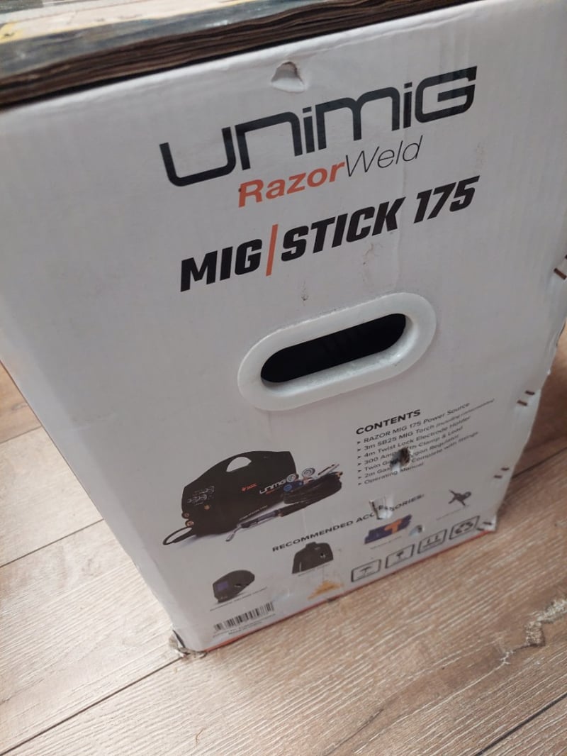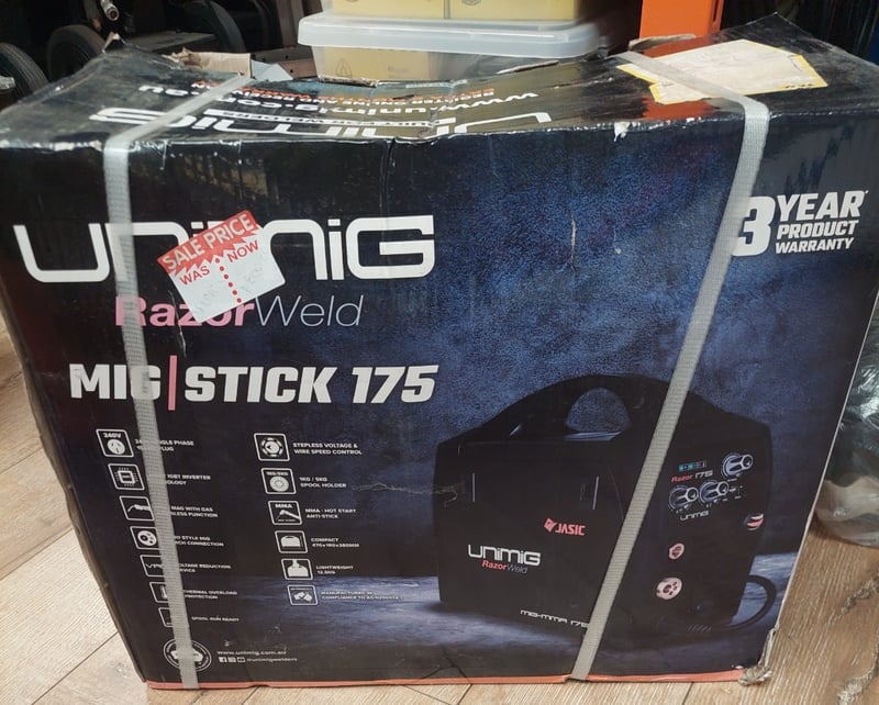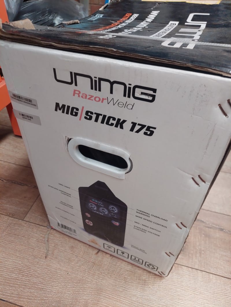 Unimig RazorWeld MIG/STICK 175 welding machine. This dual-process inverter welder features MIG and stick welding capabilities, making it versatile for various welding applications. Key specifications include IGBT inverter technology, stepless voltage and wire speed control, thermal overload protection, and spool gun compatibility. The unit incorporates ARCS hot start technology for improved arc initiation, compact ergonomic design, and lightweight construction for portability. Includes carrying handle and comprehensive control panel with intuitive operation. Comes with 3-year product warranty. Original packaging. Brand New - Unopened