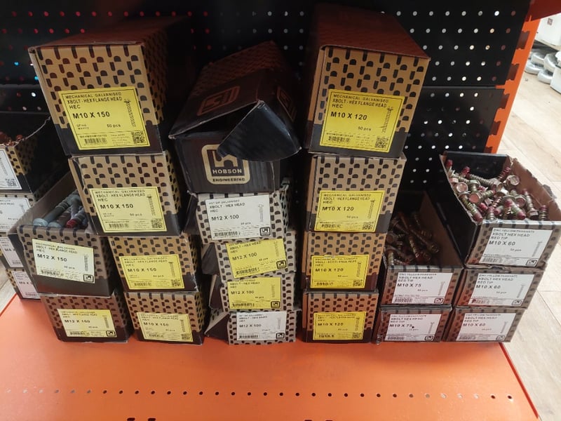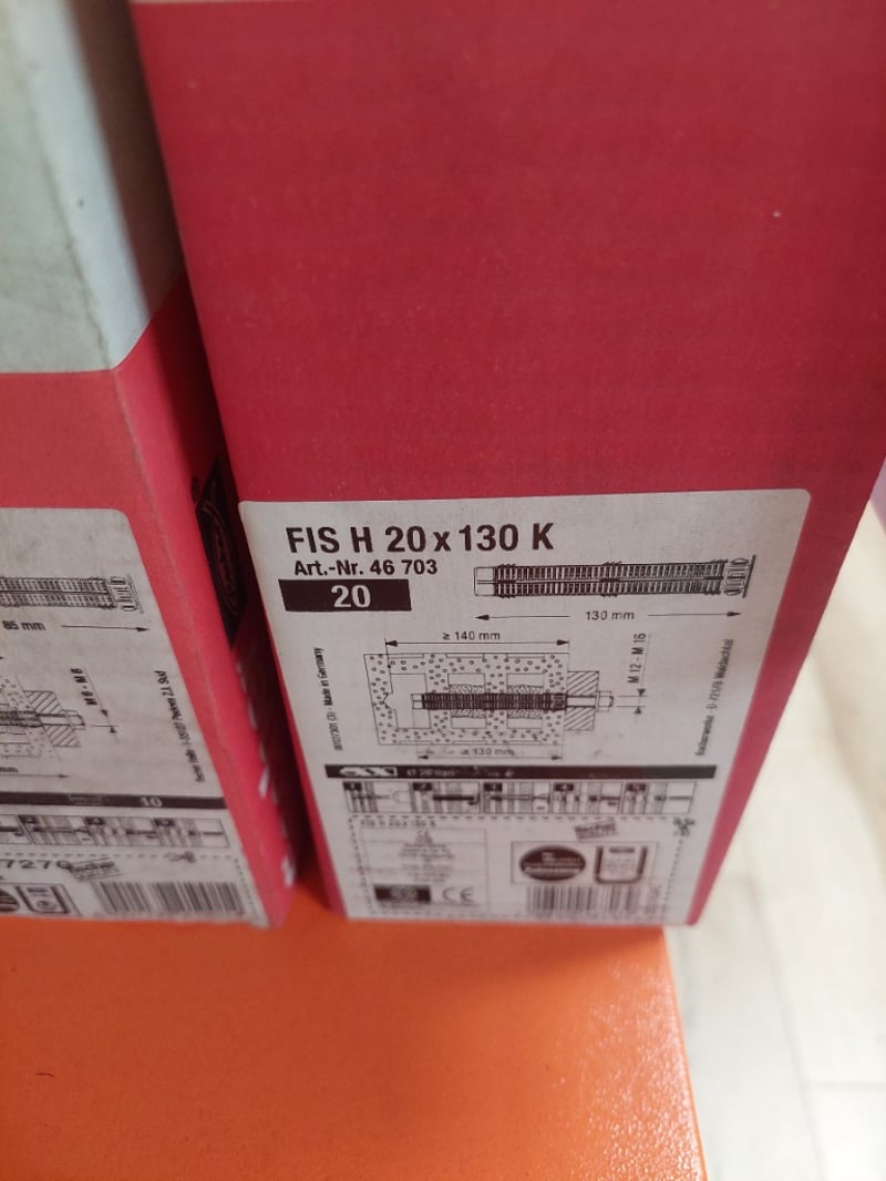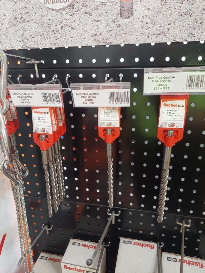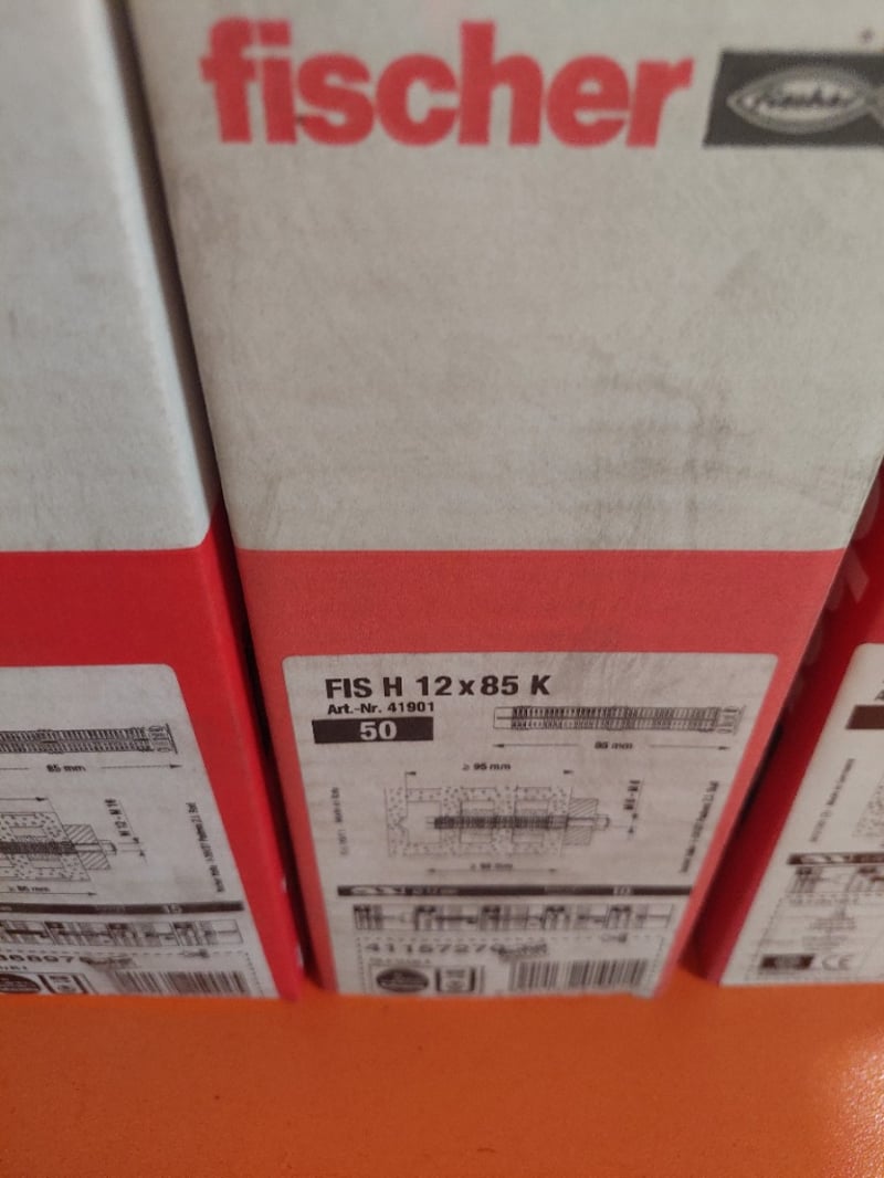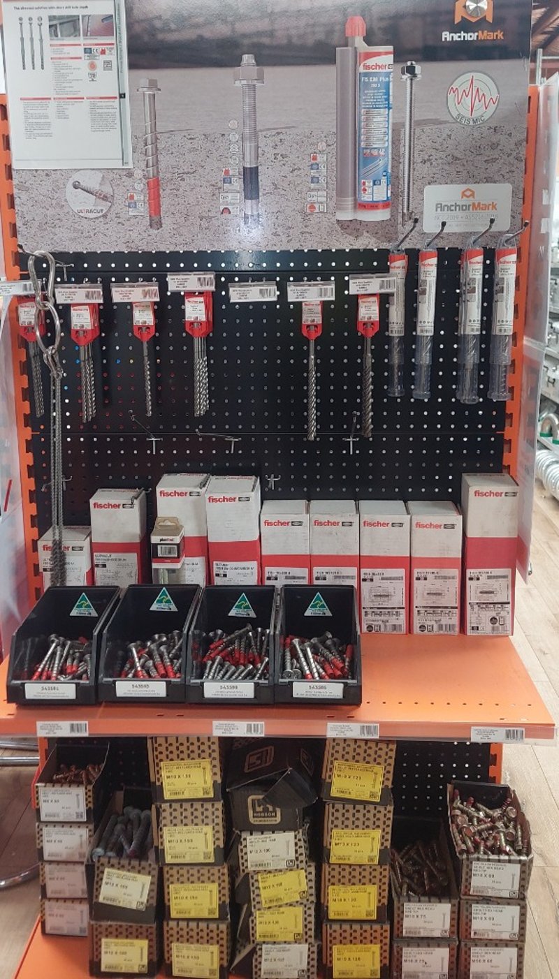 Lot of assorted construction fixings and anchoring systems including Fischer chemical anchors, drill bits, threaded rods, bolts, and assorted fastening hardware. Includes boxed items and loose stock displayed on shelving. Sold as Lot Note: Untested / As Displayed