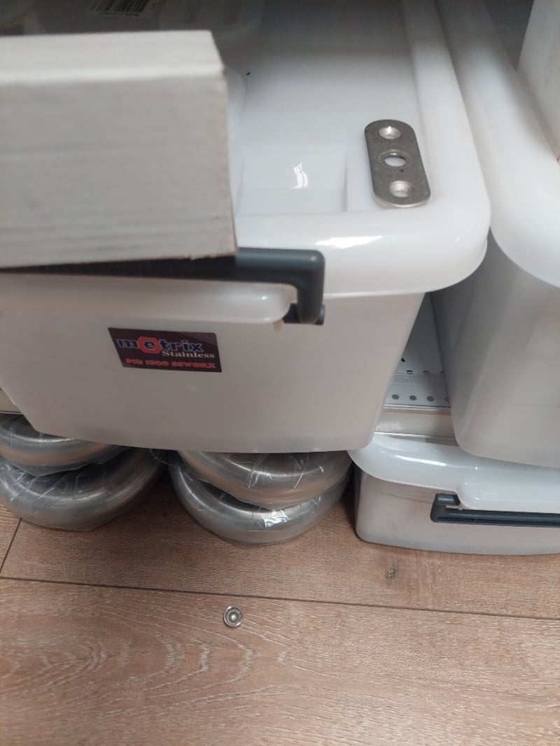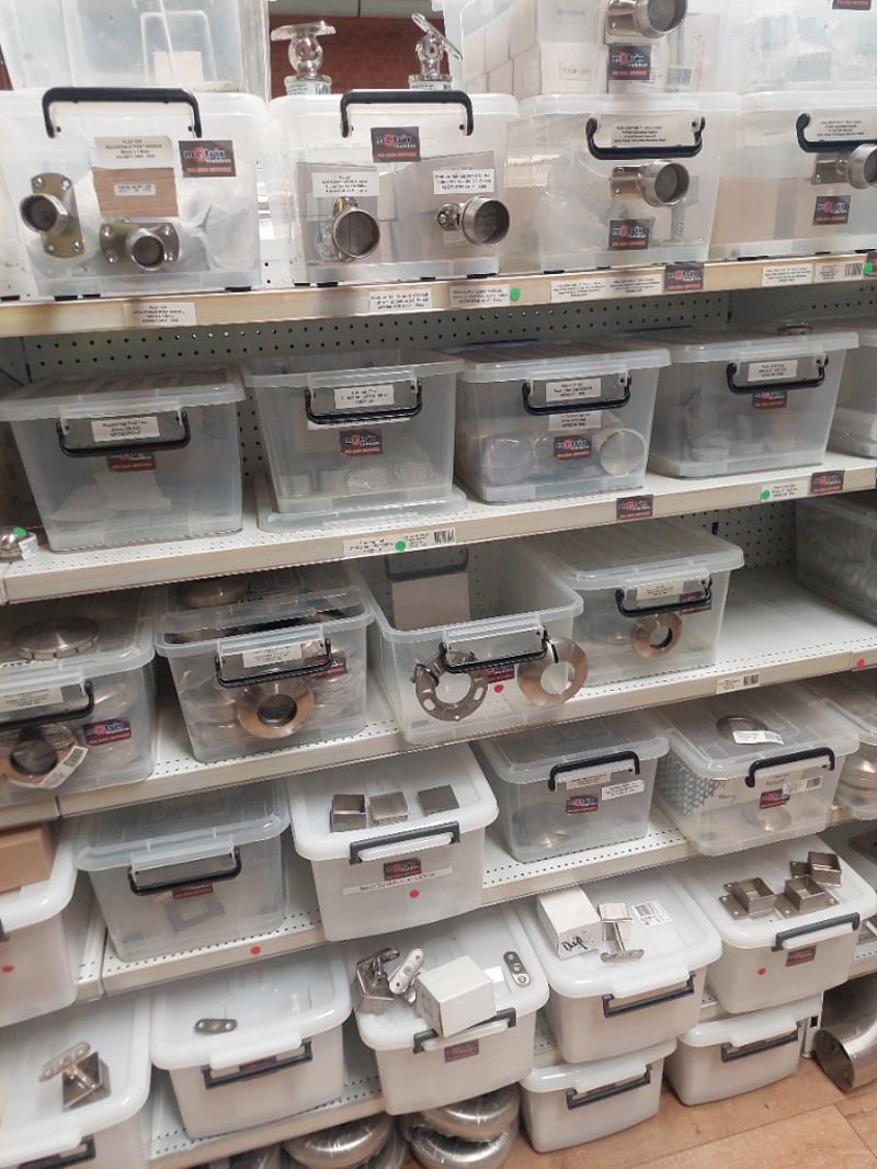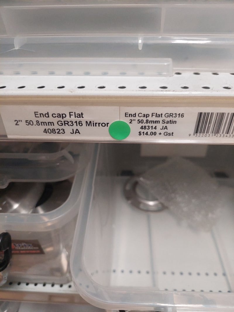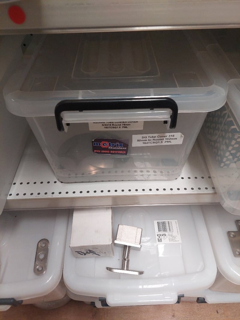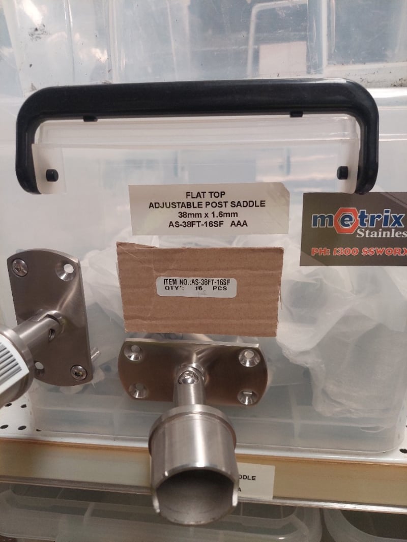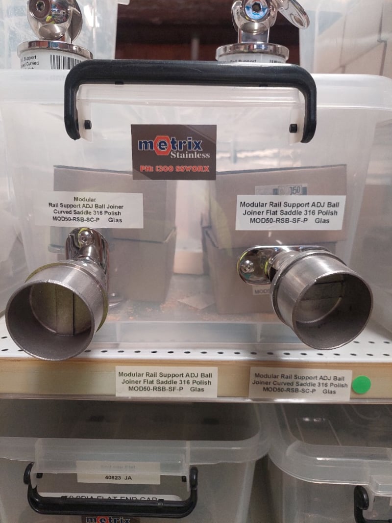 Stainless Steel hardware and plumbing fixtures collection. Lot includes modular rail support adjustable ball joiners (flat and curved saddle variants in 316 polish), flat top adjustable post saddles (38mm x 1.6mm, AS-38FT-16SF), SQ tube covers (316 stainless, 50mm to 102mm), and end cap flats (2" 50.8mm GR316 in mirror and satin finishes). All items feature premium stainless steel construction suitable for marine, architectural, or industrial applications. Components are individually packaged in clear storage containers with labelled inventory tags for easy identification and organization. Sold as Lot