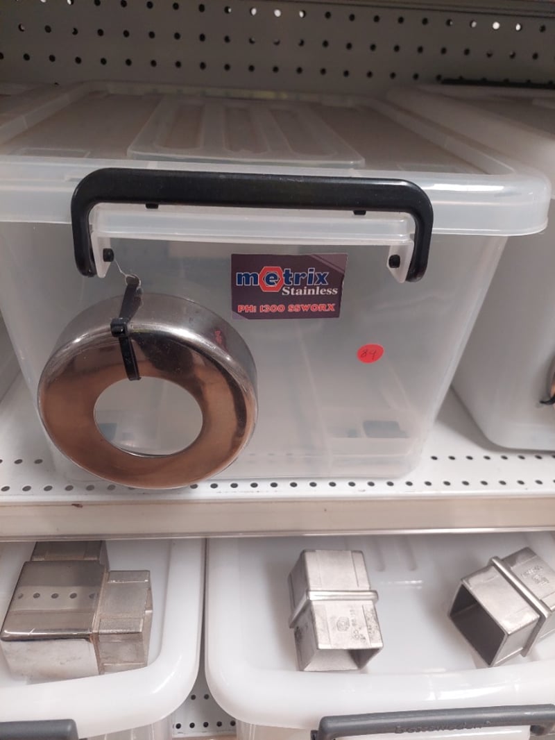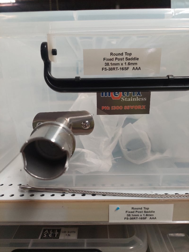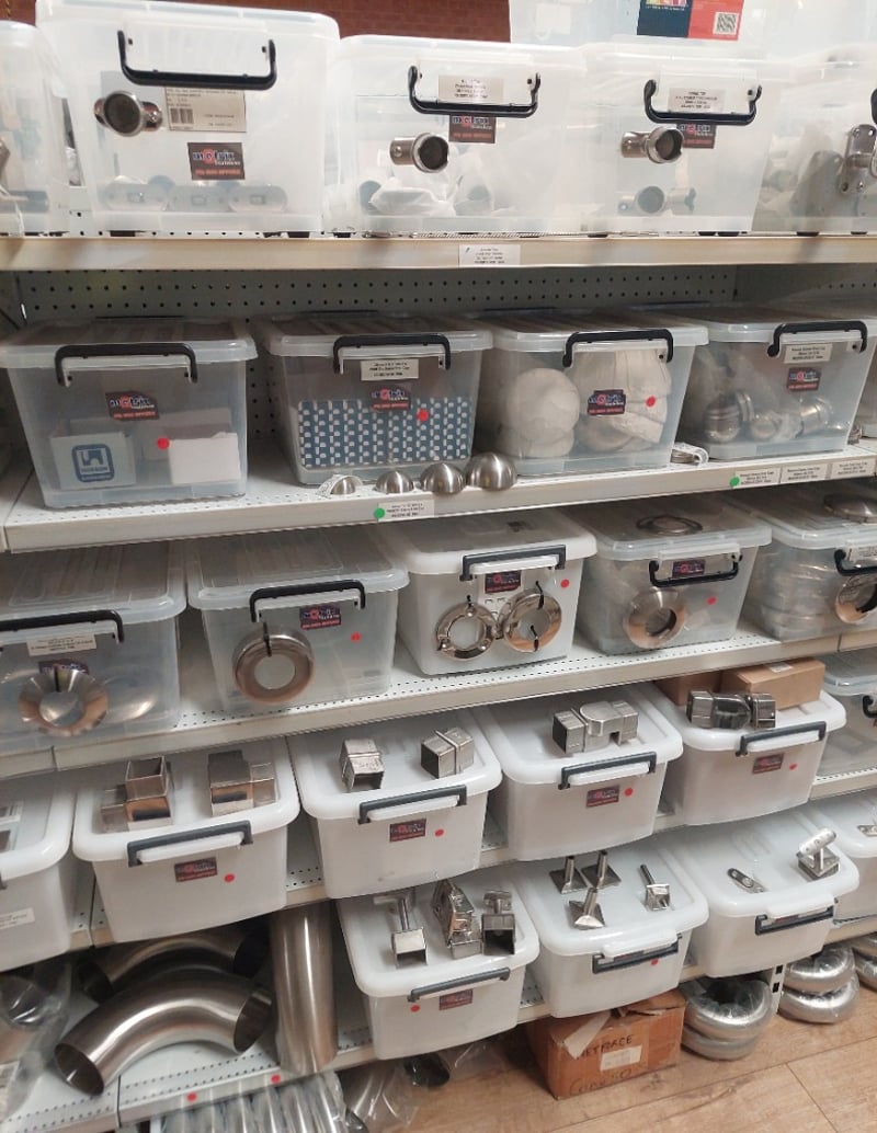 Stainless Steel plumbing and pipe fittings collection. Comprehensive assortment includes round top fixed post saddles (38.1mm x 1.6mm, model FS-38RT-16SF), round dome end caps (50mm SS 316, model MOD50-ECD-P with glass), round flat end caps (50mm SS 316, model MOD50-ECF-P), various elbow joints, pipe clamps, brackets, and threaded connectors. Materials are stainless steel 316 and 304 grade. Components are individually packaged in clear plastic storage containers with black carry handles, each labeled with product specifications and batch codes. Ideal for commercial plumbing installations, industrial applications, or trade stock. Sold as Lot