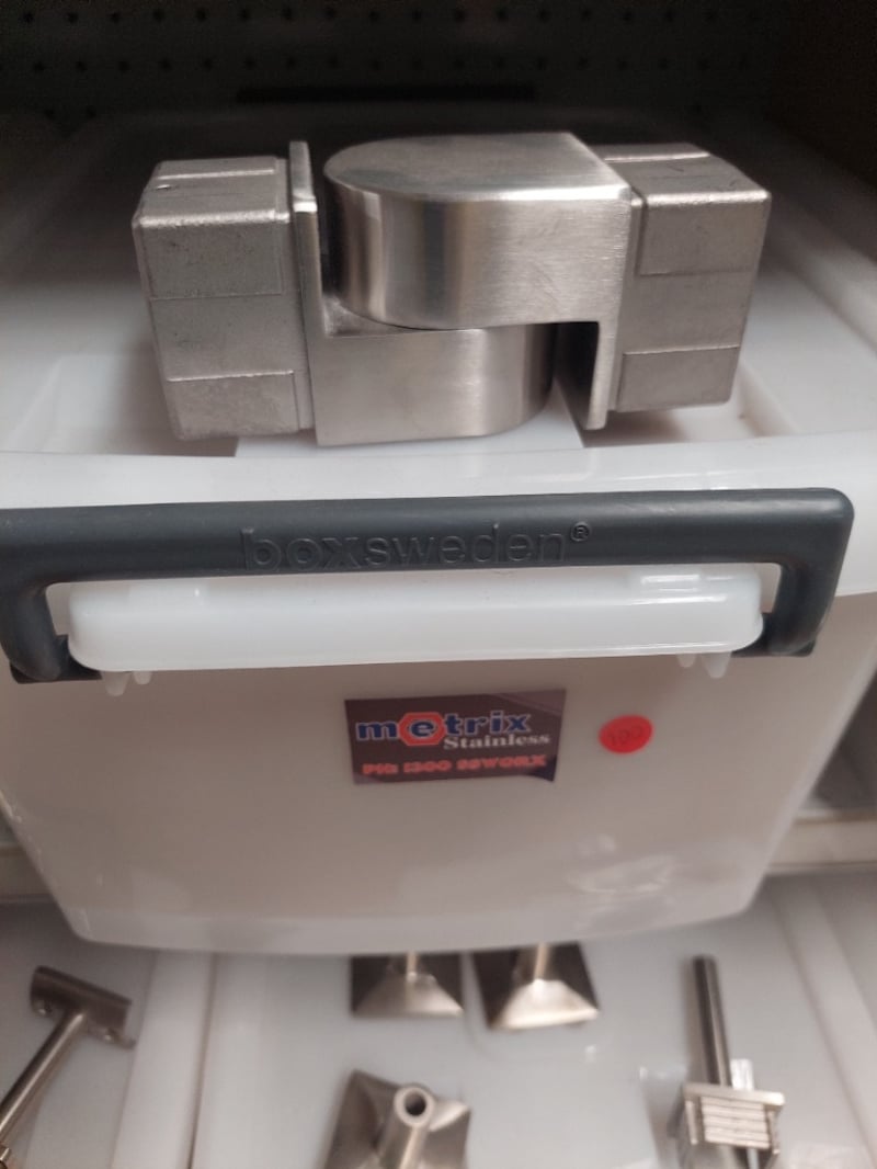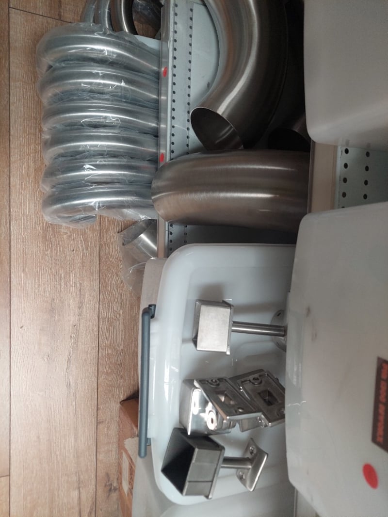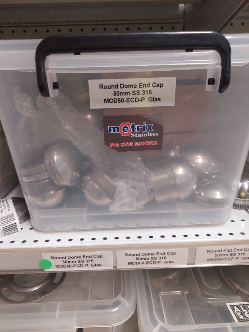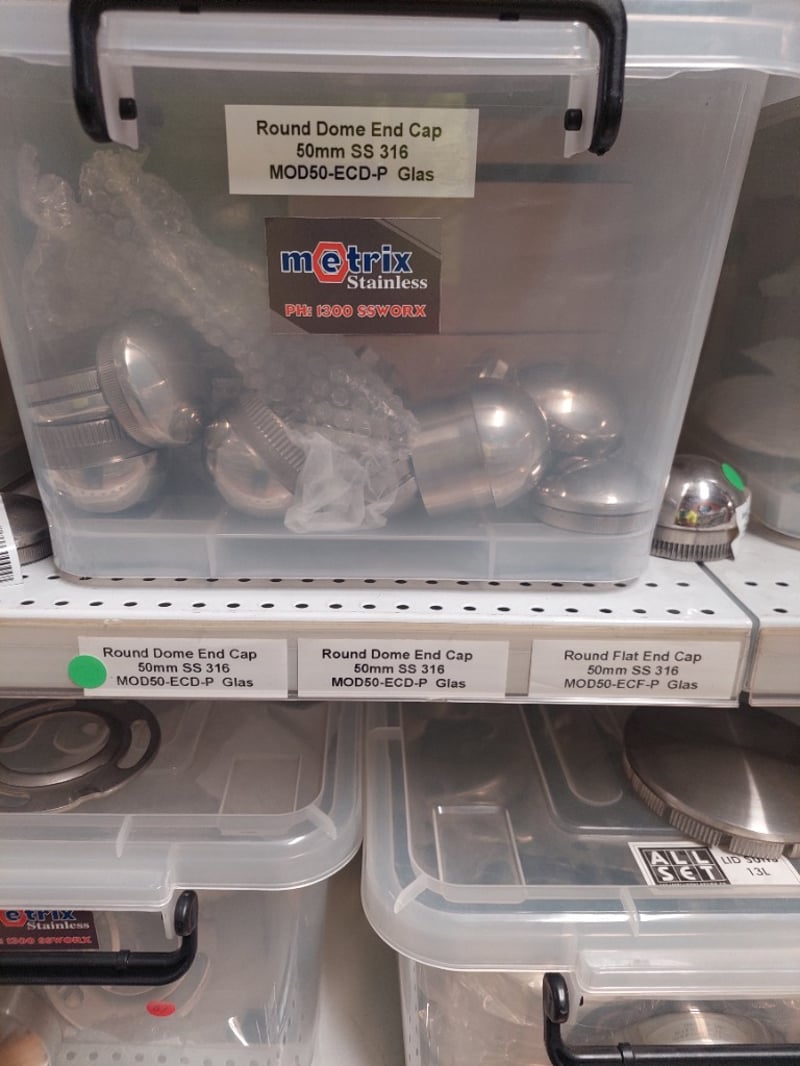Stainless steel plumbing and architectural hardware components. Assortment includes round top fixed post saddles (38.1mm x 1.6mm), round dome end caps (50mm SS 316 with glass), round flat end caps (50mm SS 316), wall flanges, brackets, and various fastening hardware. All items branded Matrix Stainless, PHI 1300 SSWORX. Components displayed in organized clear plastic storage containers with labeled compartments. Materials are primarily 316 stainless steel construction, indicating superior corrosion resistance suitable for exposed or marine applications. Stock includes both polished and brushed finishes. Collection represents quality commercial-grade fittings suitable for balustrade systems, handrails, and structural support applications. Sold as Lot