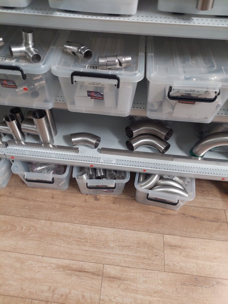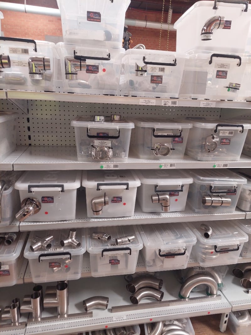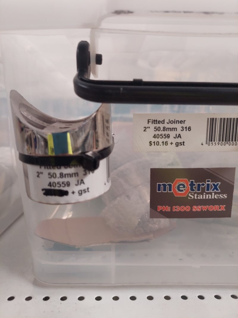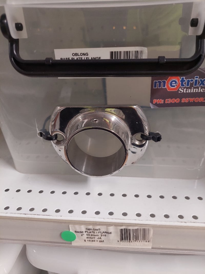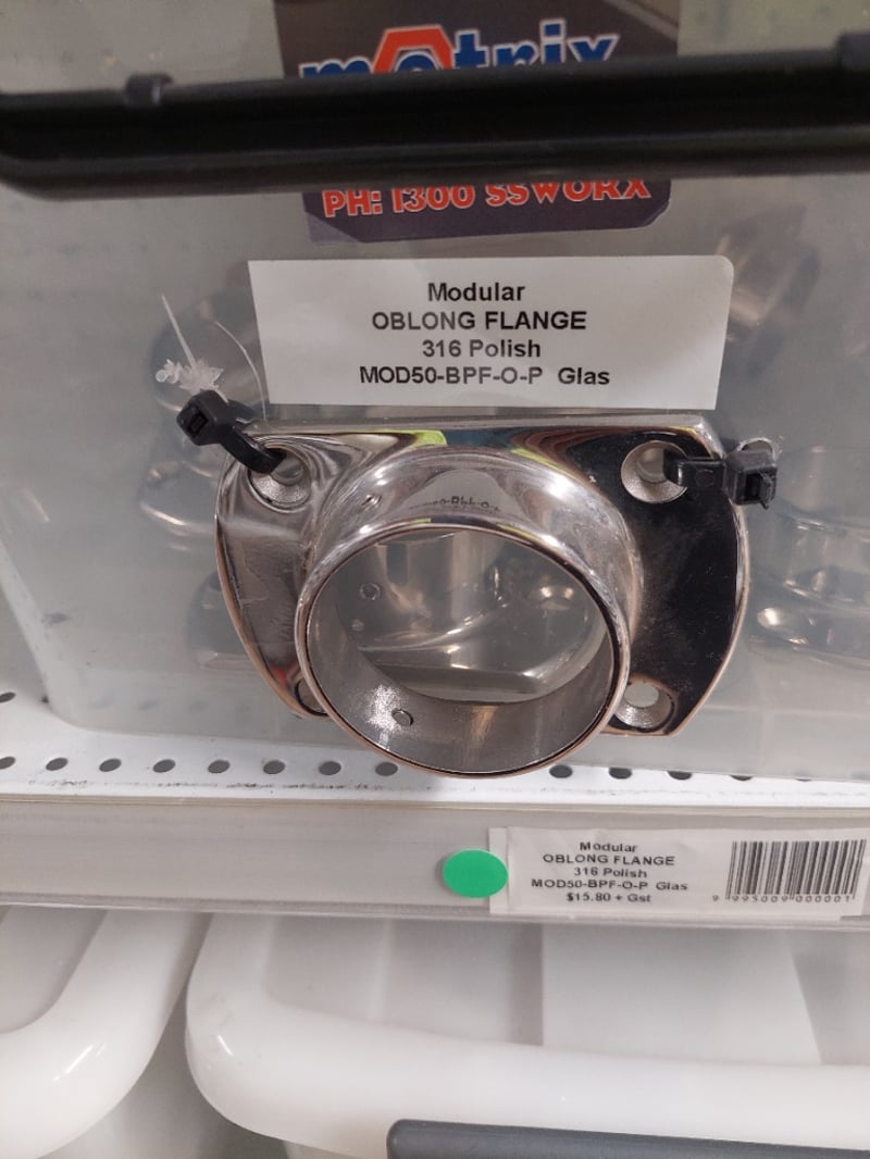 Stainless Steel plumbing and drainage fittings collection. Lot includes modular oblong flanges in 316 polished stainless steel (MOD50-BPF-O-P), oblong base plate/flanges in 50.8mm 316 stainless (40527 JA and 40559 JA), and fitted joiner connectors in 2" 50.8mm 316 stainless (40559 JA). All items feature quality stainless steel construction suitable for commercial or residential plumbing applications. Components are organized in clear plastic storage containers with labeled identification tags. Sold as Lot